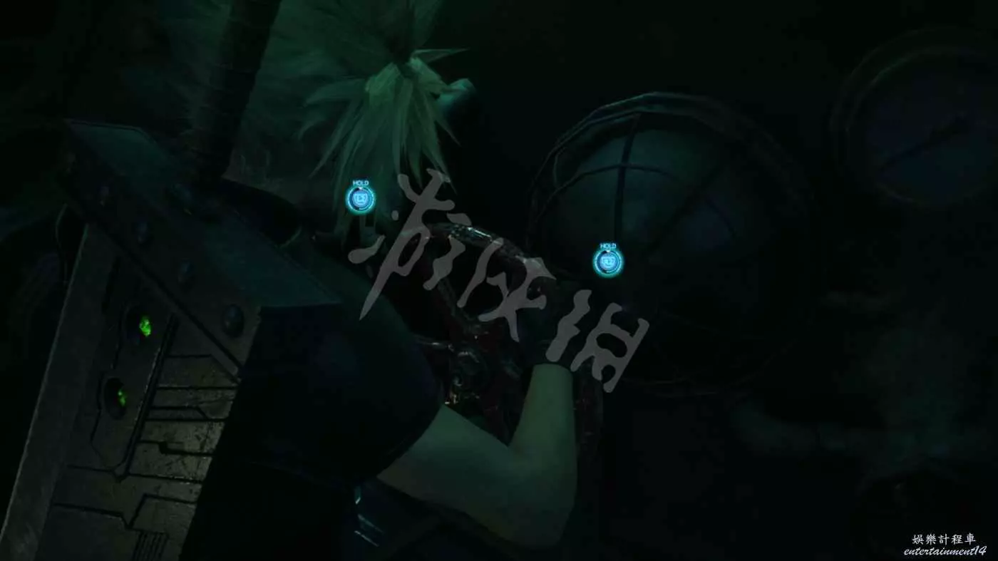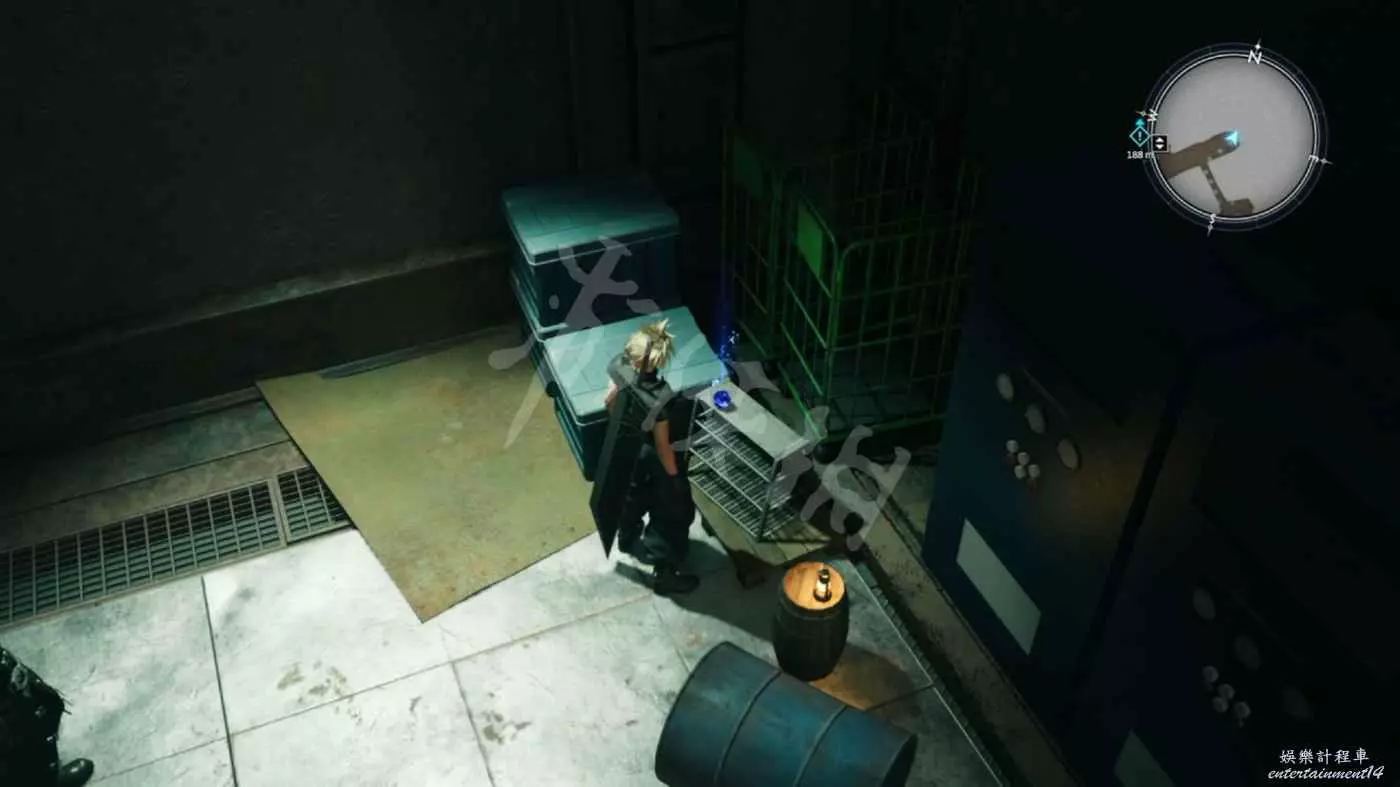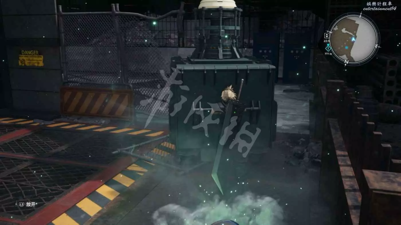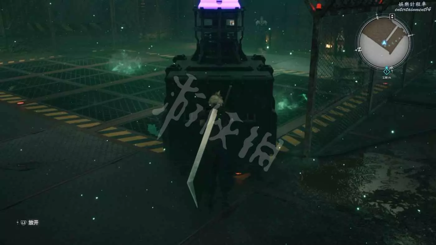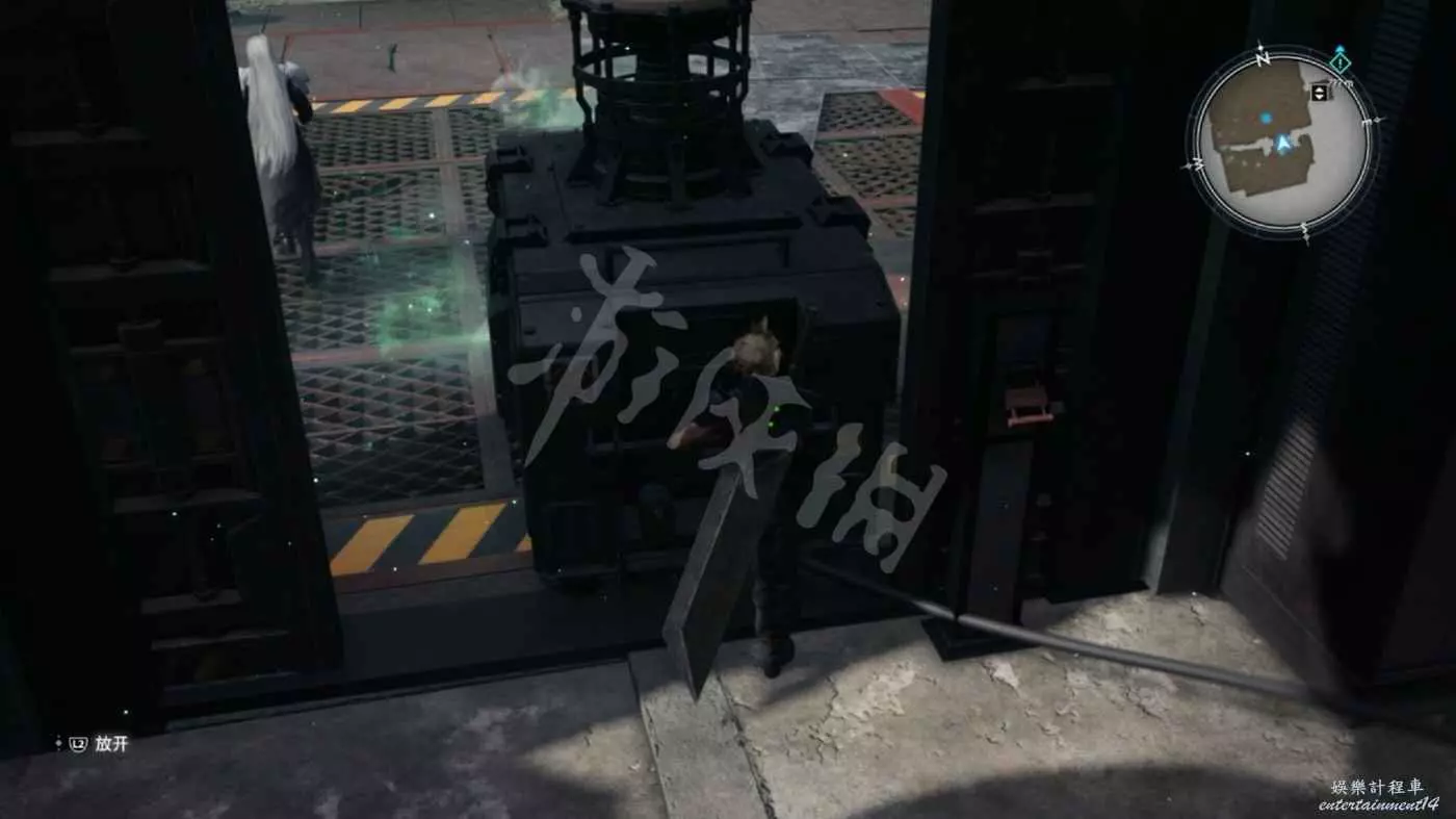來到緊閉的大門前,這裡需要拉著右側可移動的風機清除場景中的魔晄氣體(地面上有3團綠色氣體)。