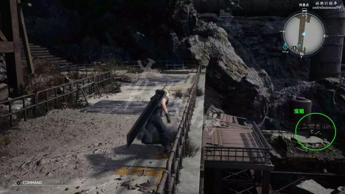 走出升降機,會看到前方拐角處有個長椅,右下方平臺有個寶箱。