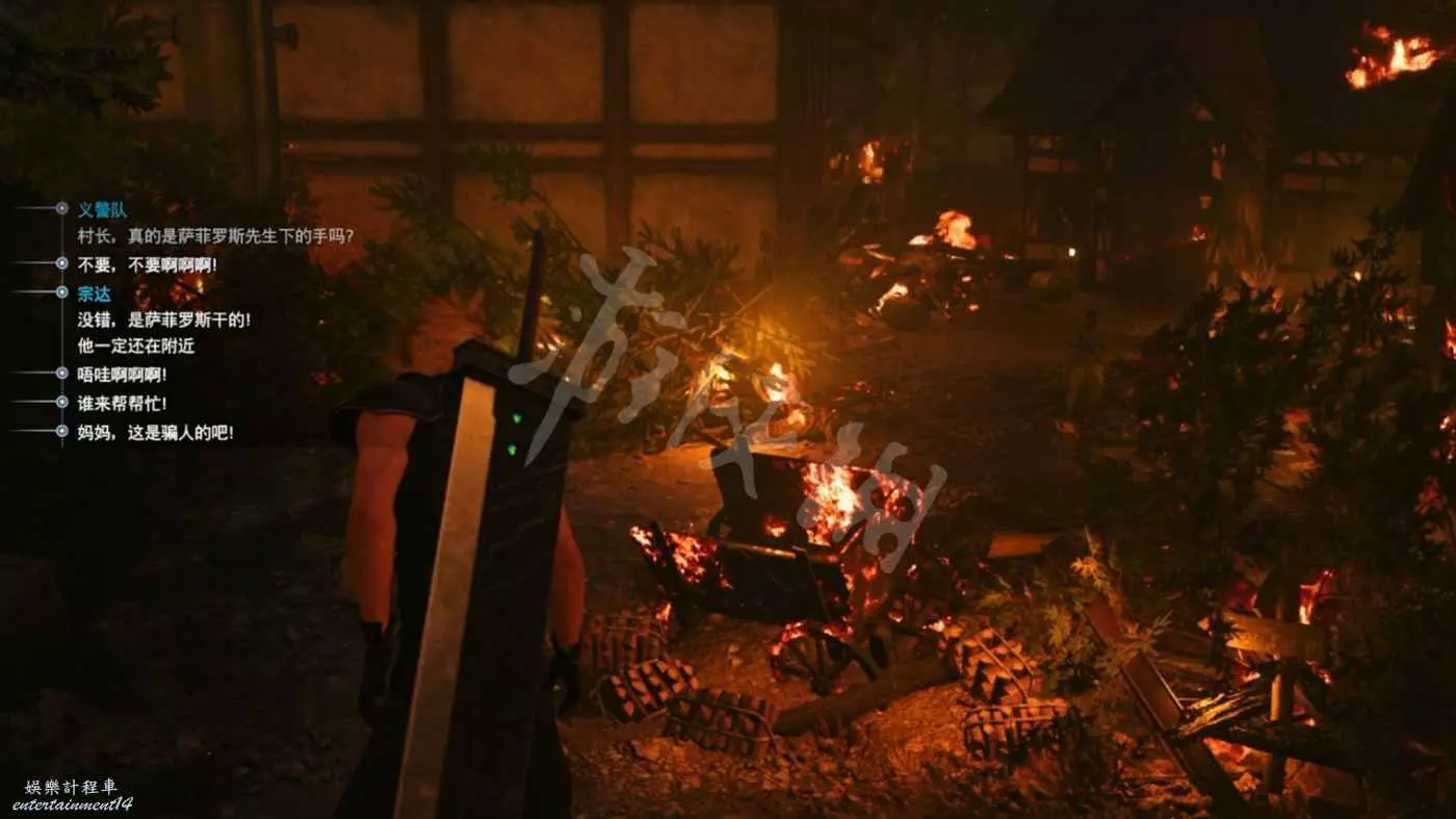 一瘸一拐地來到家門口卻被突然爆炸推開,恢復意識後發現塞菲羅斯將村長等人一一殺害……