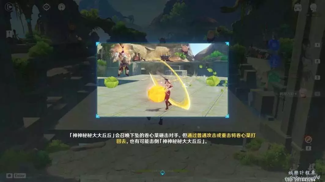 1.用普攻或者重擊將捲心菜打回去,擊倒丘丘人