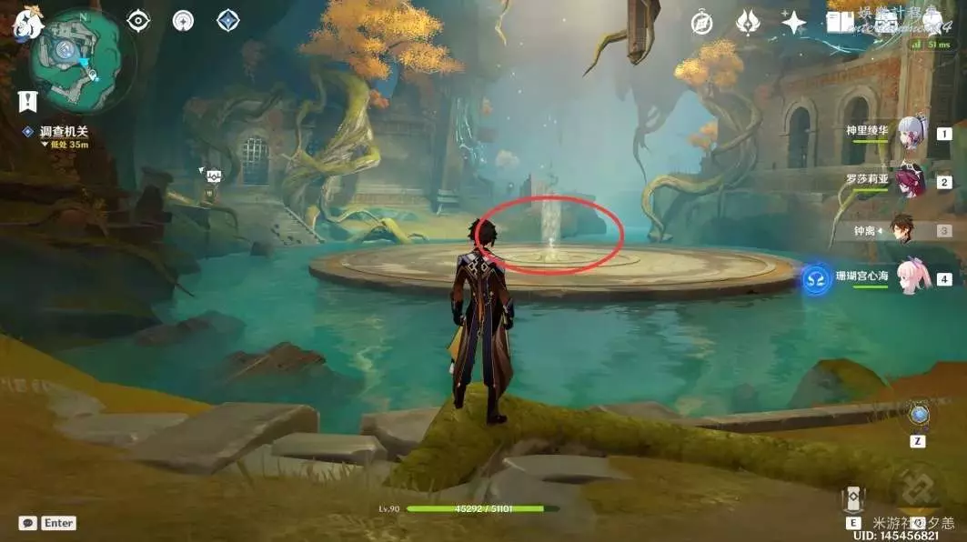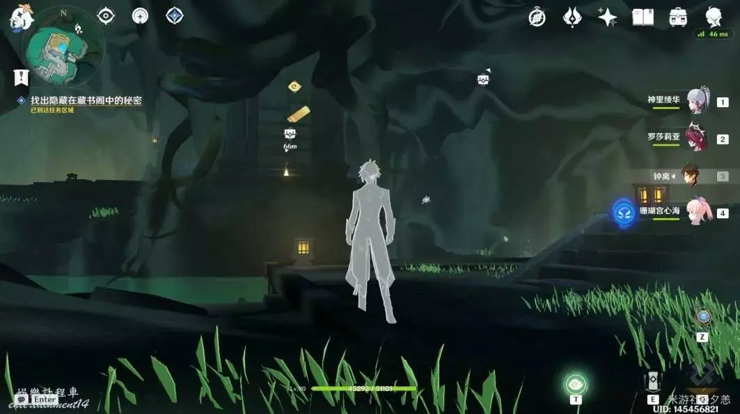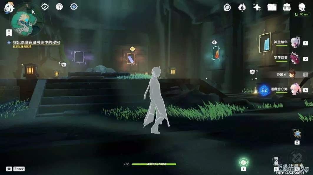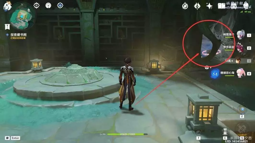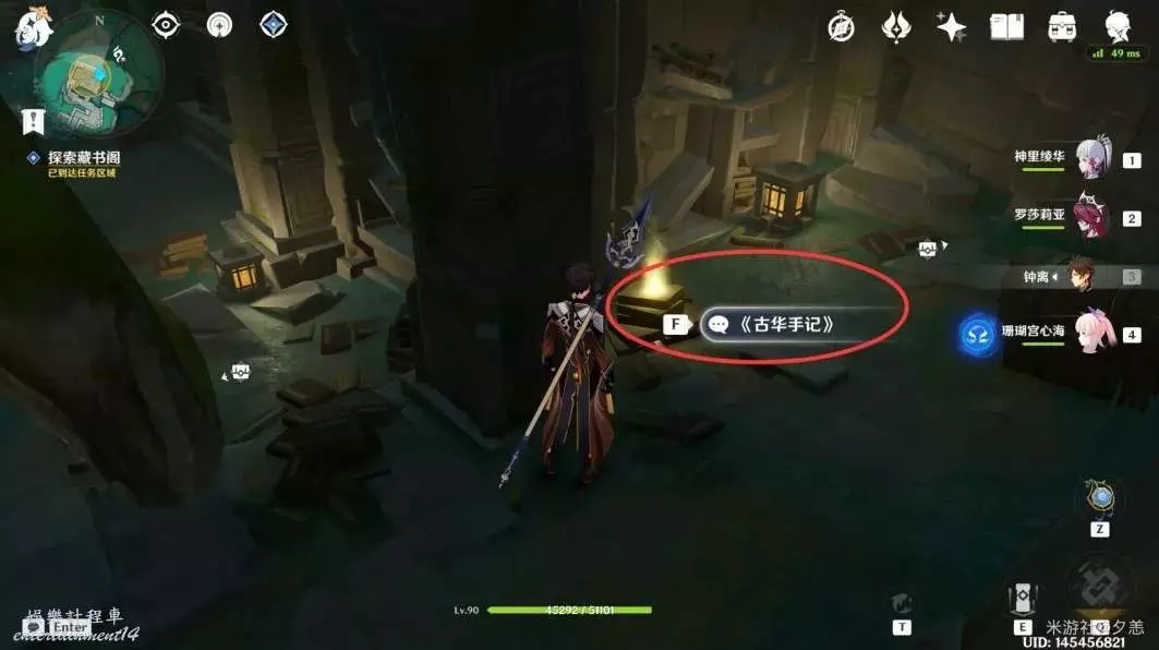 解謎:出來後可通過開啟元素視野觀察藏書閣,將帶上色彩的書籍放置在相同顏色的書架上即可完成解謎。