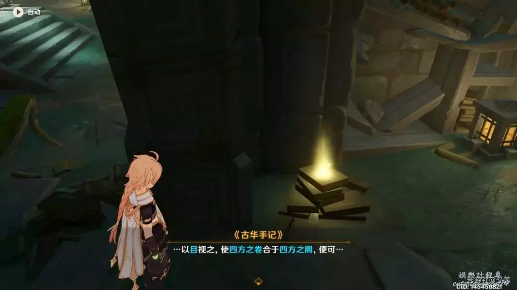 擊碎蜘蛛網,然後閱讀地上的《古華書記》,閱讀到出現藍色字體即可不用閱讀,前往解謎。