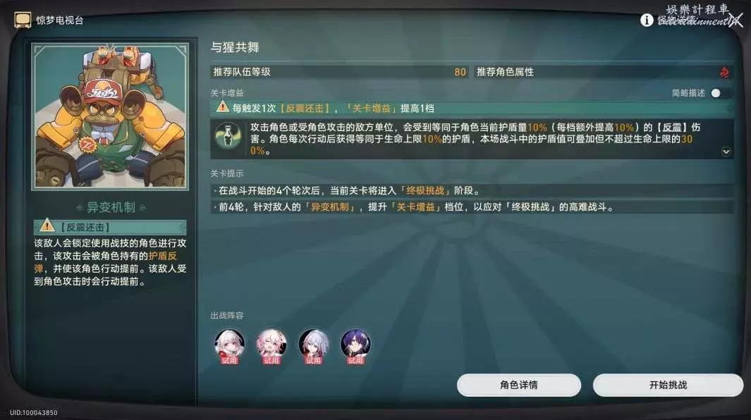 解析:戰鬥模式為虛構敘事類模式,根據異變機制,我們需要儘量多的讓角色行動,所以我們儘量使用能夠提供回合外攻擊的角色,反擊類角色是最佳的。並且由於角色行動就可以獲得護盾,所以生存完全沒有壓力,傑帕德可以被排除,剩下的四位試用角色都非常適合。