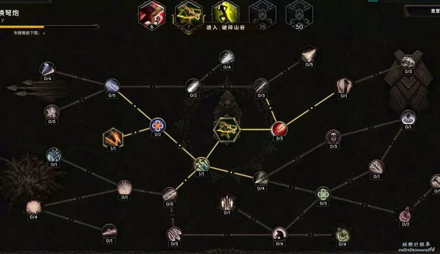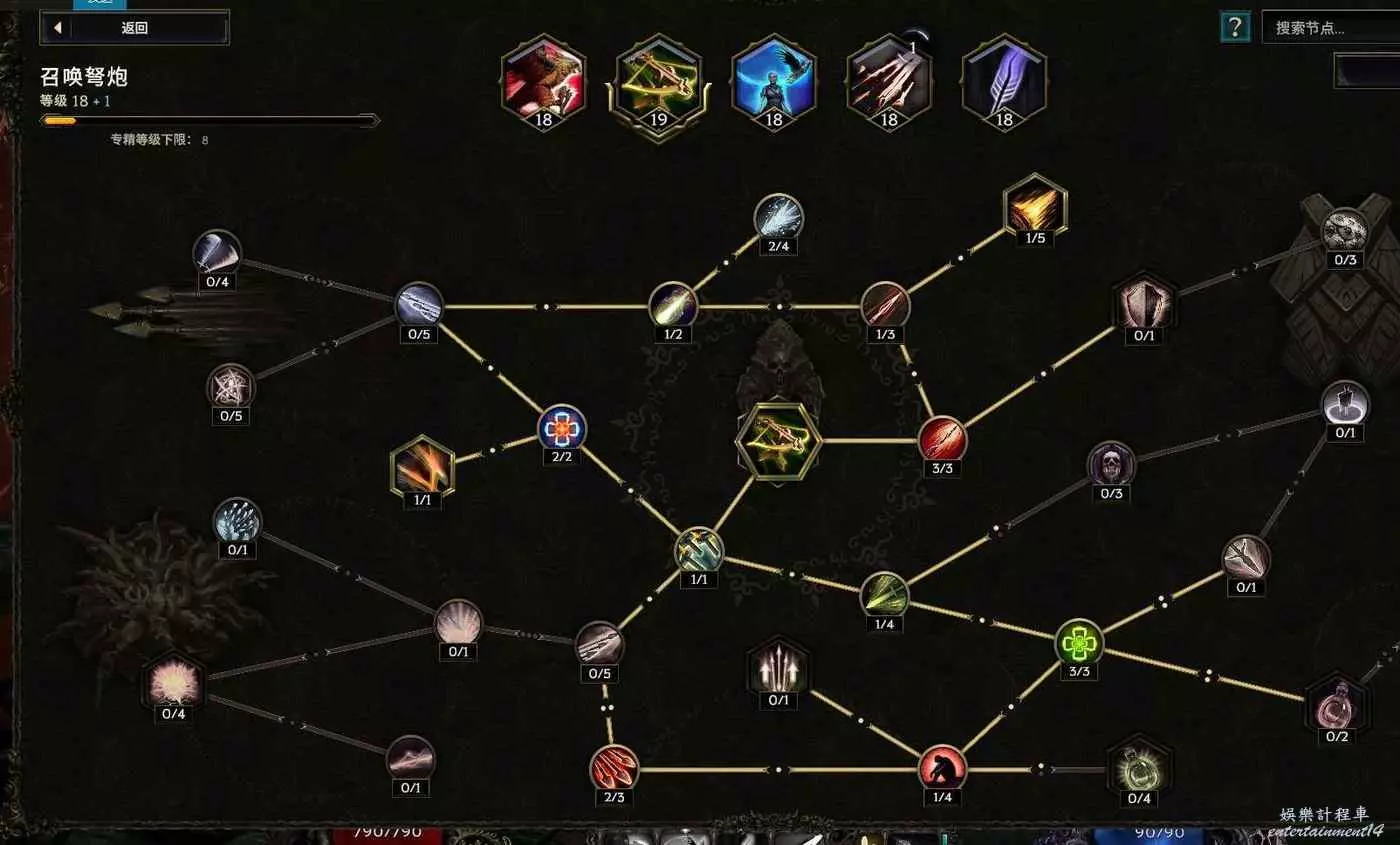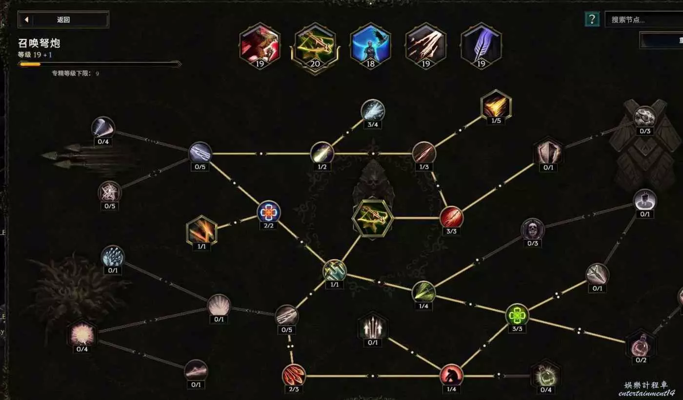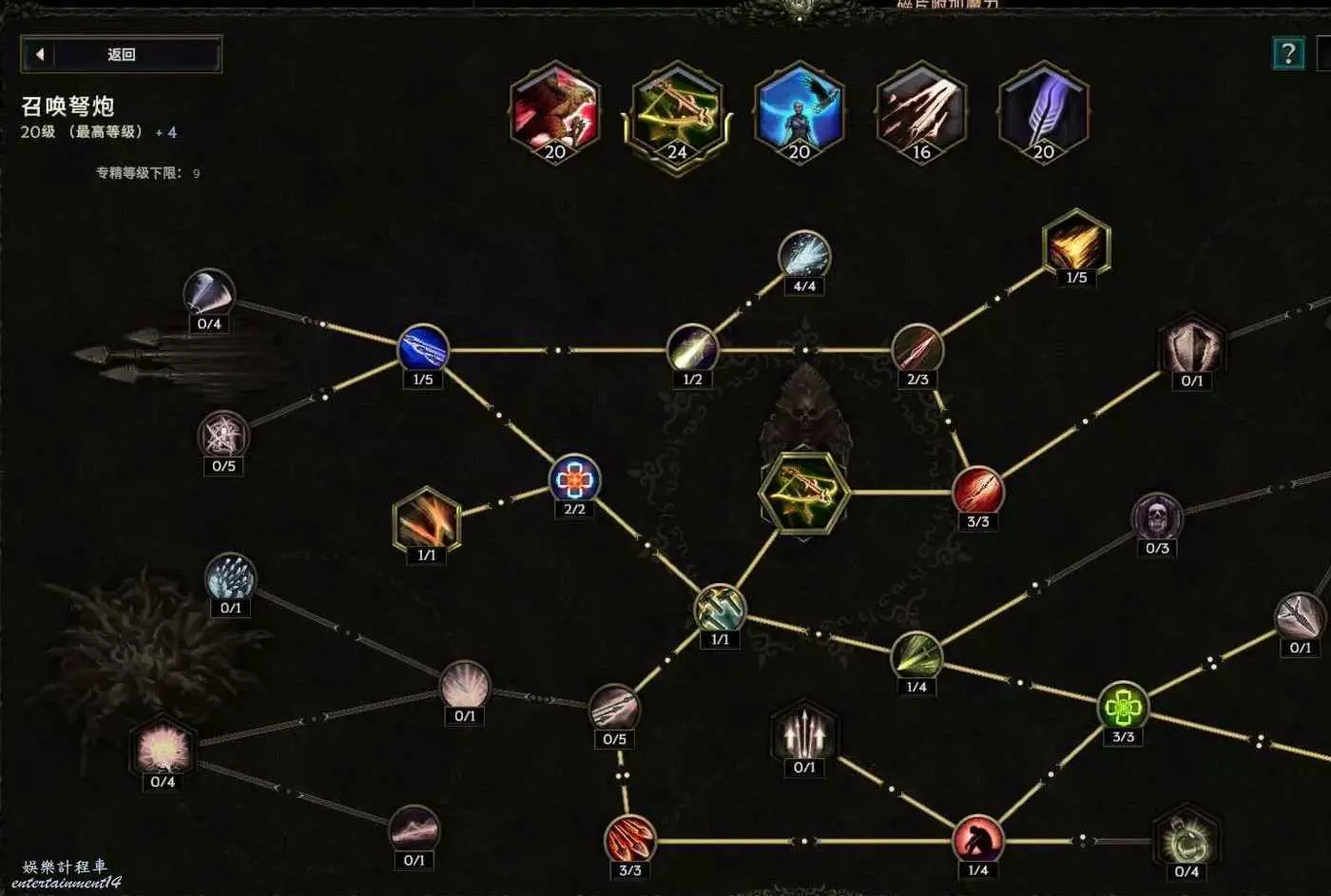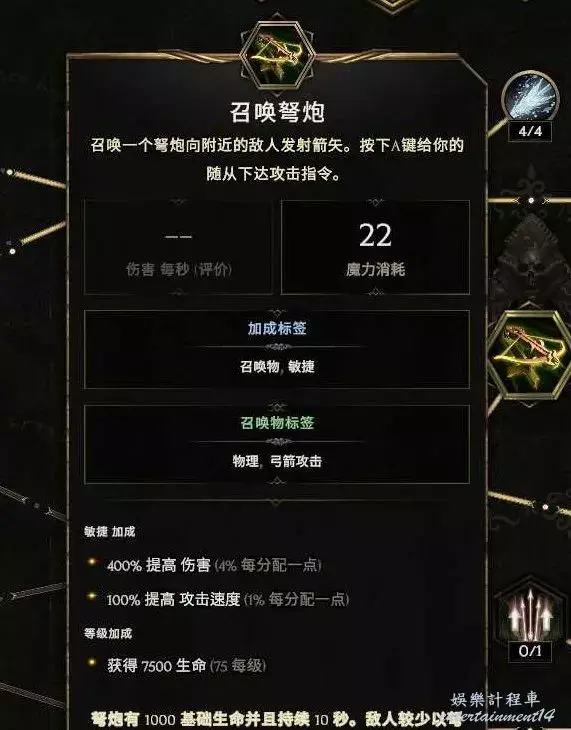 核心輸出技能,弩炮,24級如圖 技能等級不夠優先去掉減攻速增傷或者減傷害增攻速的點~