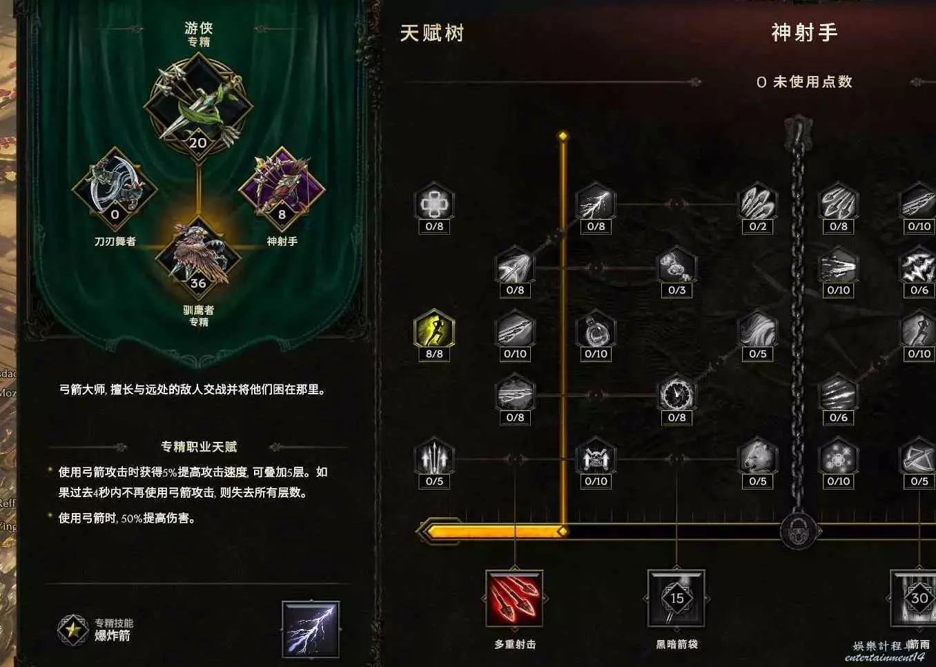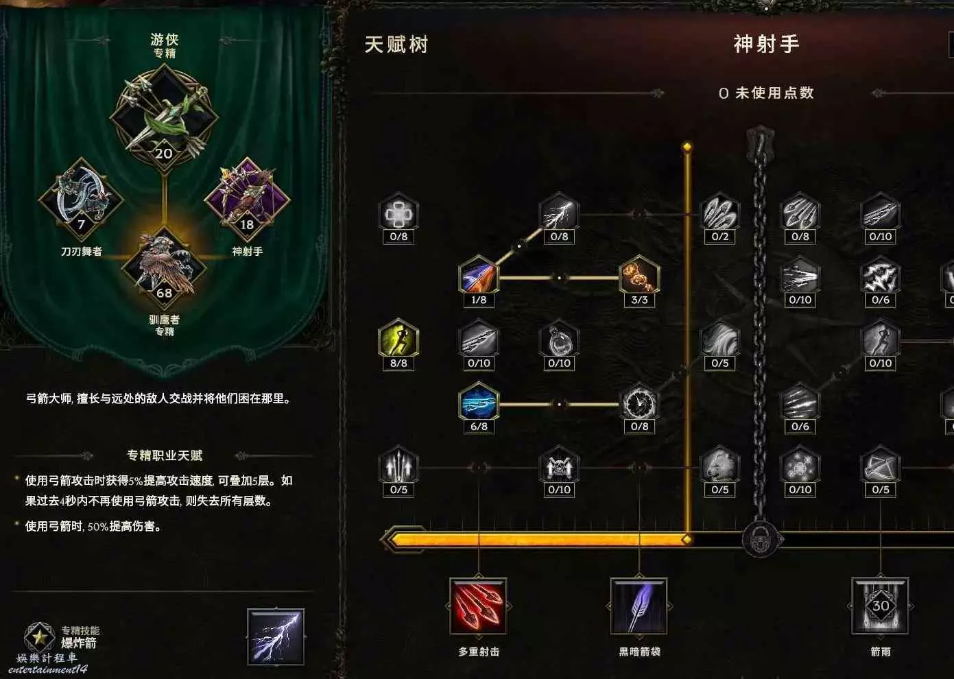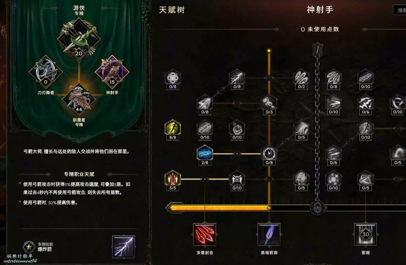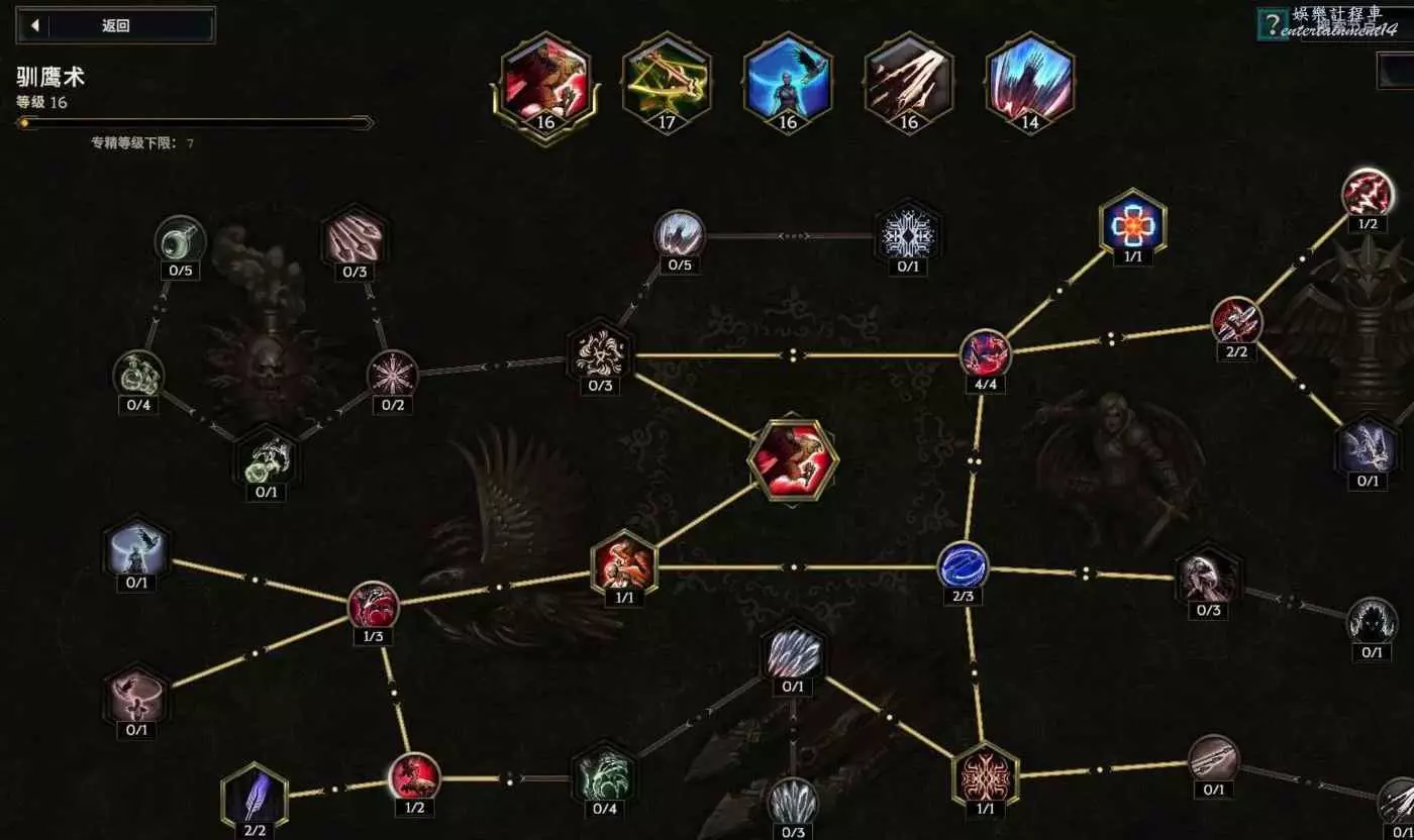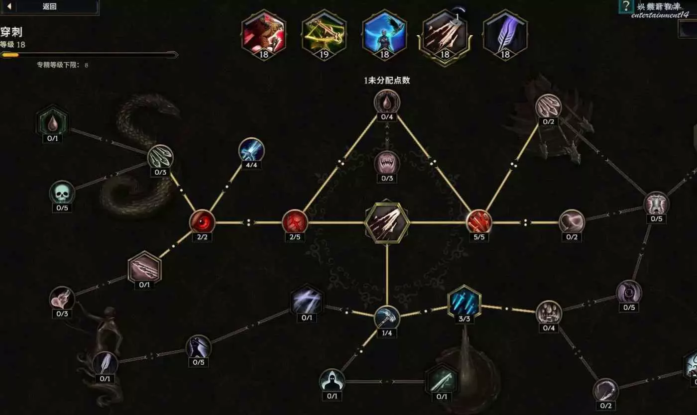 核心輸出技能,弩炮,24級如圖 技能等級不夠優先去掉減攻速增傷或者減傷害增攻速的點~