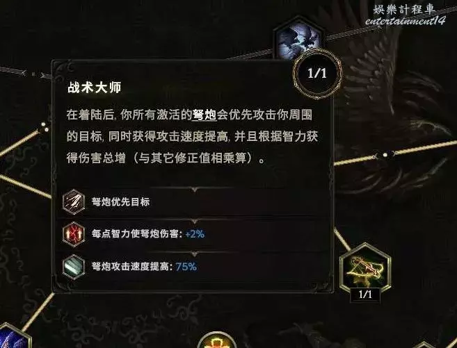 上版本弩炮還是小渣渣,這版本buff太多直接起飛,第一個配合馴鷹的空域襲擊技能,這個節點空域襲擊後 ,搭配後期45+的智力屬性,可以達成接近2.5倍以上more的增傷,注意這個是已經啟動的弩炮,所以爆炸弩玩法不太適配,官方暗示去玩射擊弩~