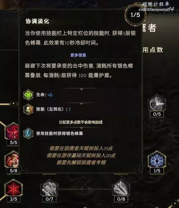 2.耐傷閾值容易拉高,通過下面這個節點,沒有挨打之前,那麼你就多了15%生命最大值的耐傷閾值,繼續防止秒殺。基礎耐傷閾值只有20%的生命最大值,接近翻倍。再弄下耐傷 2000+血以後 有接近800的耐傷閾值 ~到這個血線就60%減傷(堆滿),單次傷害超過這個也重頭開始算