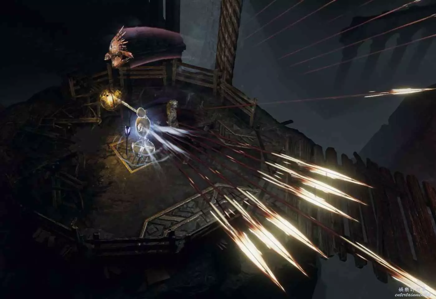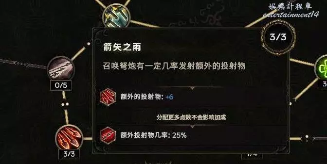 弩炮原始射擊只有1發箭,清圖如何解決》,因為弩炮攻速非常快,所以配合他這個節點,就可以4次攻擊包含1次多重射擊,配合穿透1怪的效果,達成了類似亂舞多重射擊的弓流派~