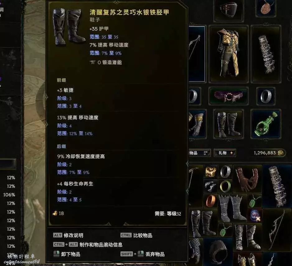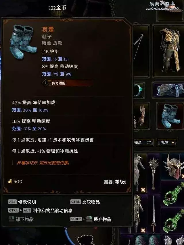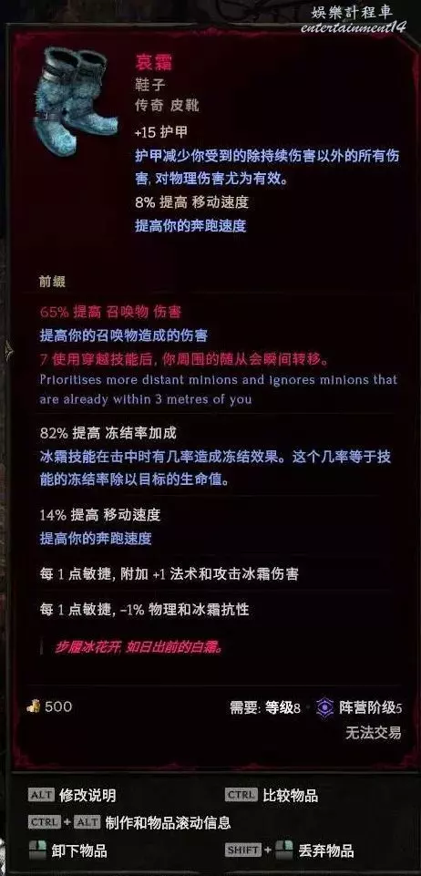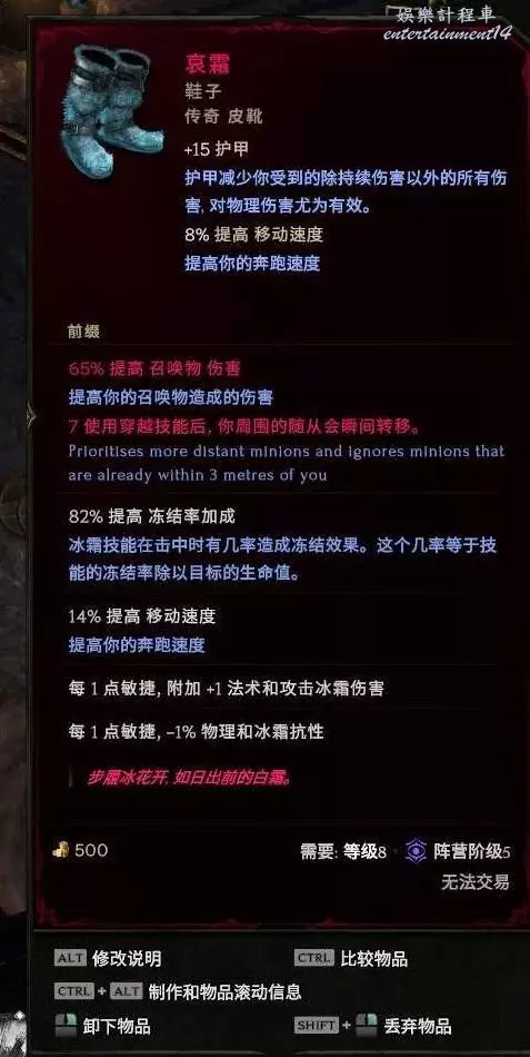 鞋子:哀霜 ,世界掉落 (預言、昇華符文or90火之靈刷鞋暗金節點),合成詞綴推薦實驗詞綴 穿越技能隨從瞬移 這個5級及以上就行,高了更好