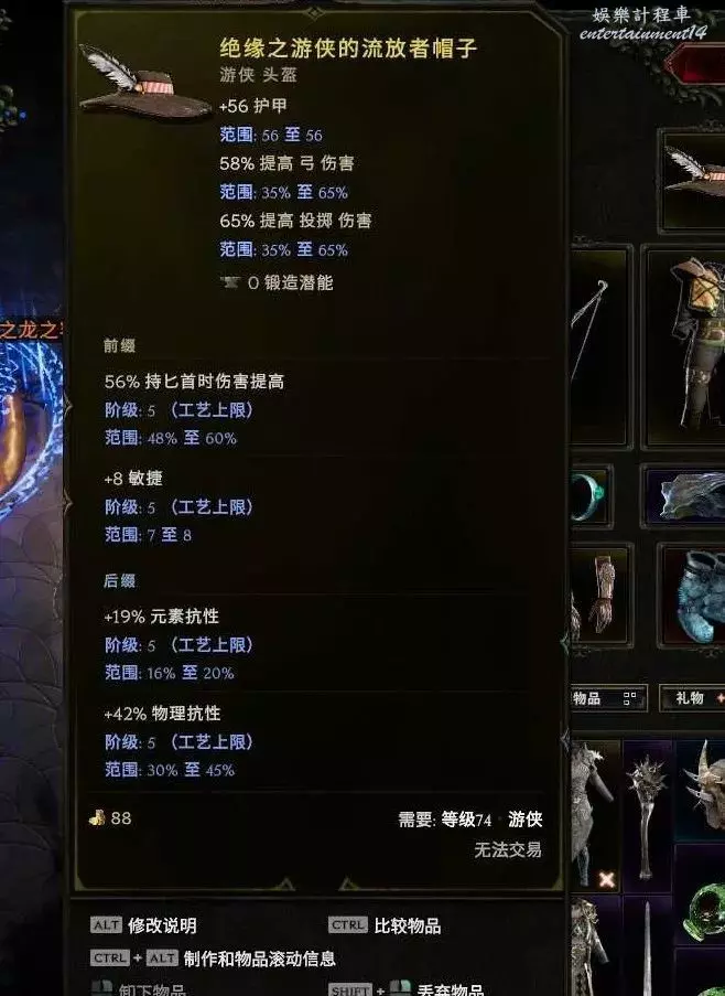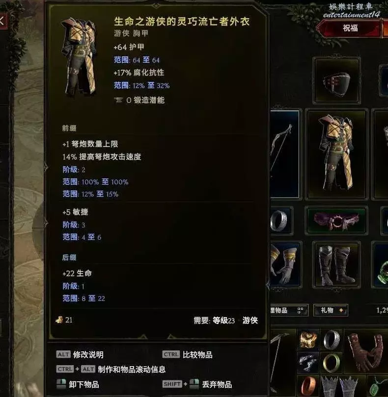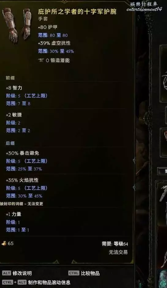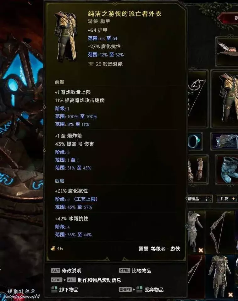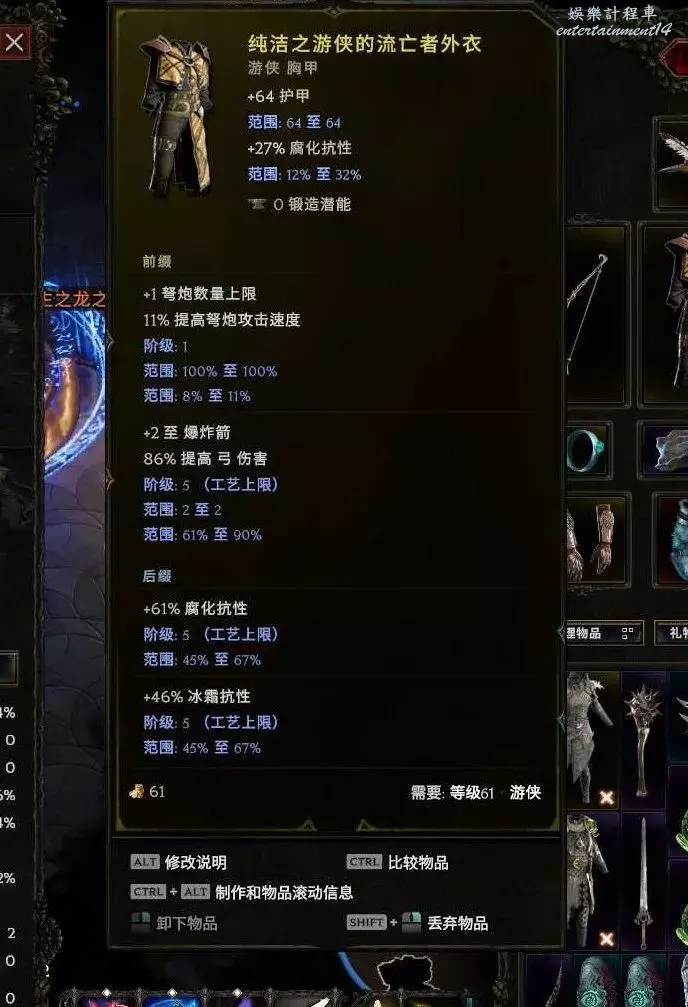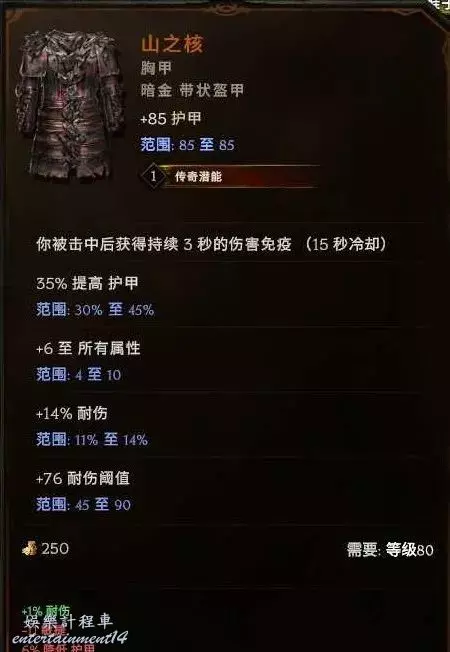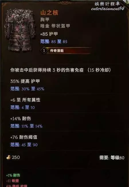 胸甲:耐傷、暴擊避免、敏捷、躲避等基底都行 首碼弩炮上限 敏捷 字尾 生命% 抗性等 可以封印個1級的持弓傷害。後期推薦下面這個暗金,合成詞綴+2弩炮上限,無光4難度boss12%幾率掉落,出孔難度較大,但是生存提升很顯著,他的擊中無敵在銀色帷幕之後,銀色帷幕躲避擊中不會觸發這個哦~雙保險~