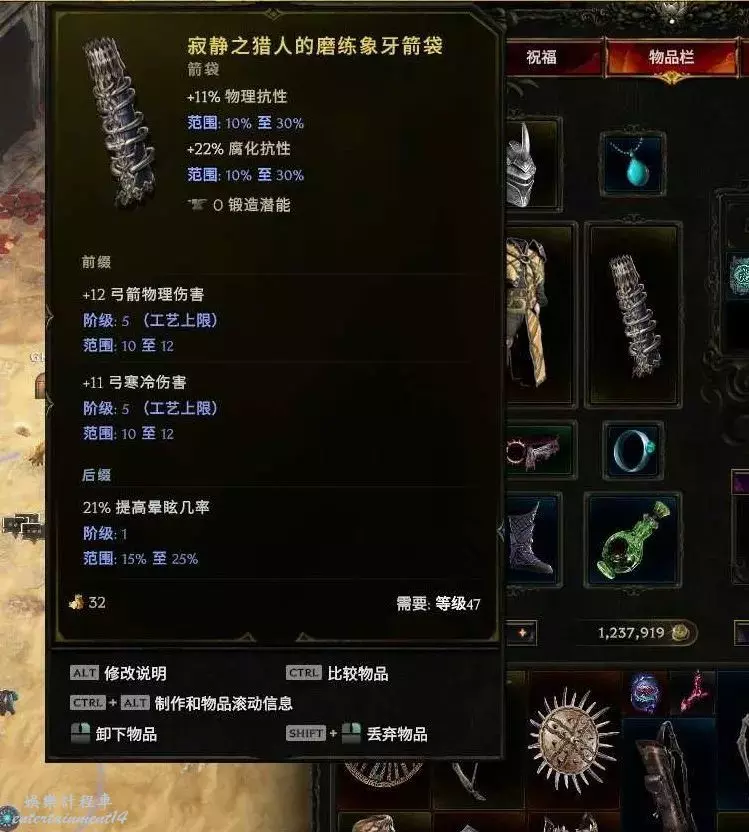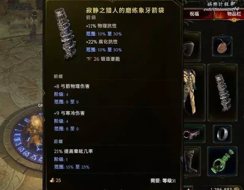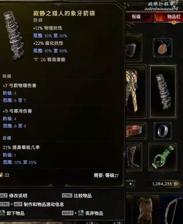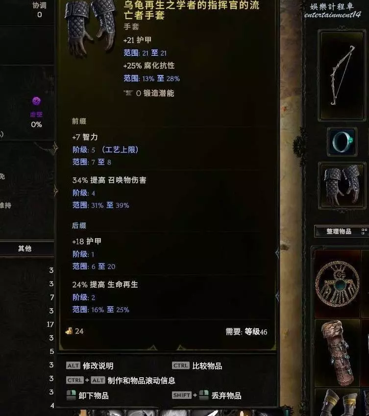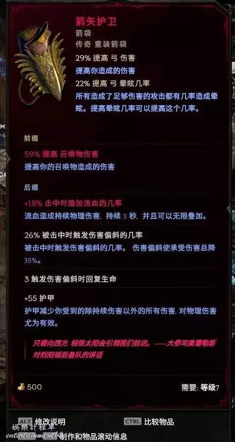 箭袋:箭矢護衛 合成推薦敏捷+抗或者弓物理傷害 or召喚傷害 敏捷最好,世界掉落 (預言、昇華符文or58憎惡刷弓暗金節點)