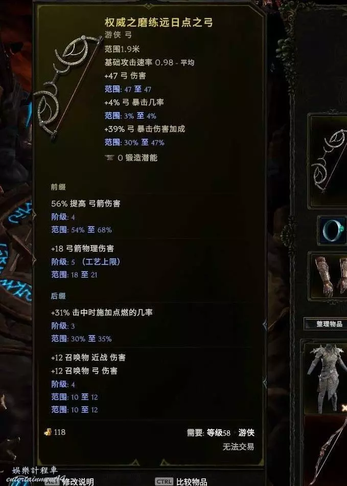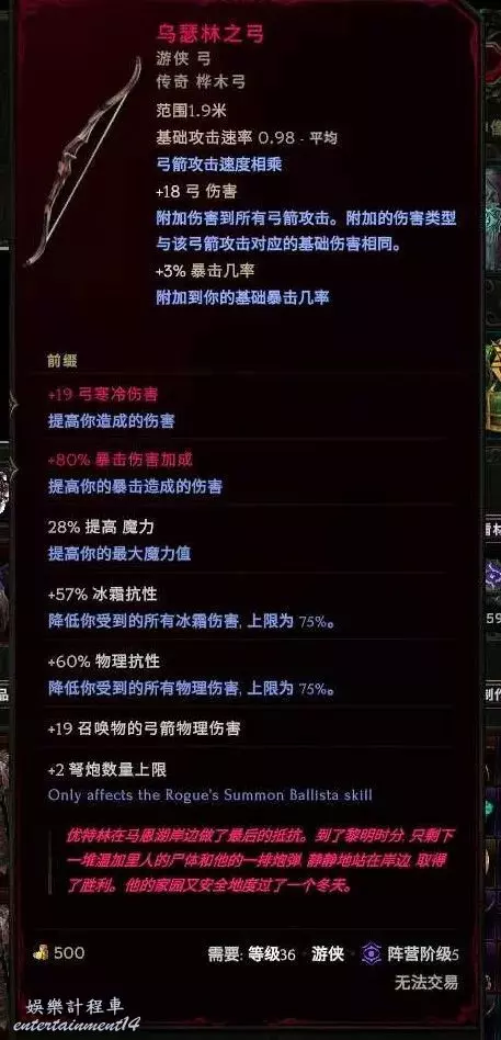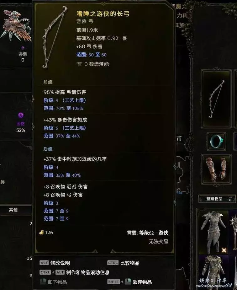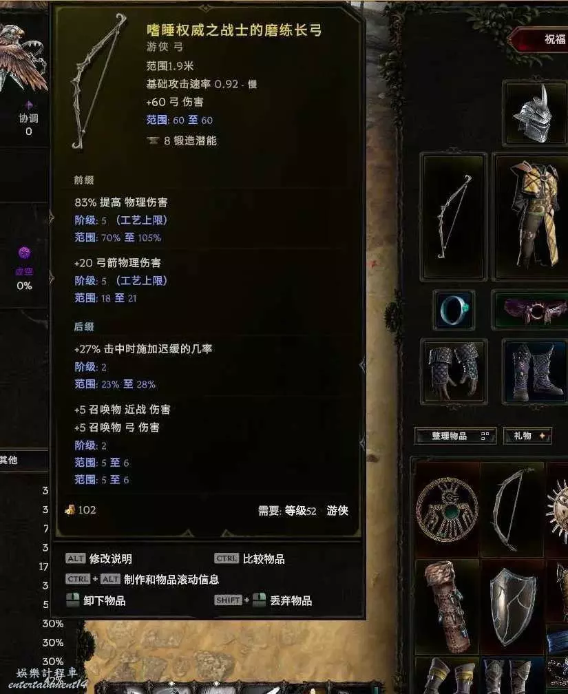 武器:烏瑟林之弓 世界掉落 (預言、昇華符文or58憎惡刷弓暗金節點),合成詞綴優先爆傷其次寵物弓物理傷害 然後是弓物理傷害 這3個最好 其他+xx弓元素傷害都差不多了。+2弩炮boss提升很大, 刷圖沒什麼感覺,裝備不大行的,沒合成出來詞綴之前不如黃弓強。黃弓 爆傷基底~ 首碼暴擊傷害 弓物理傷害 字尾召喚物弓傷害