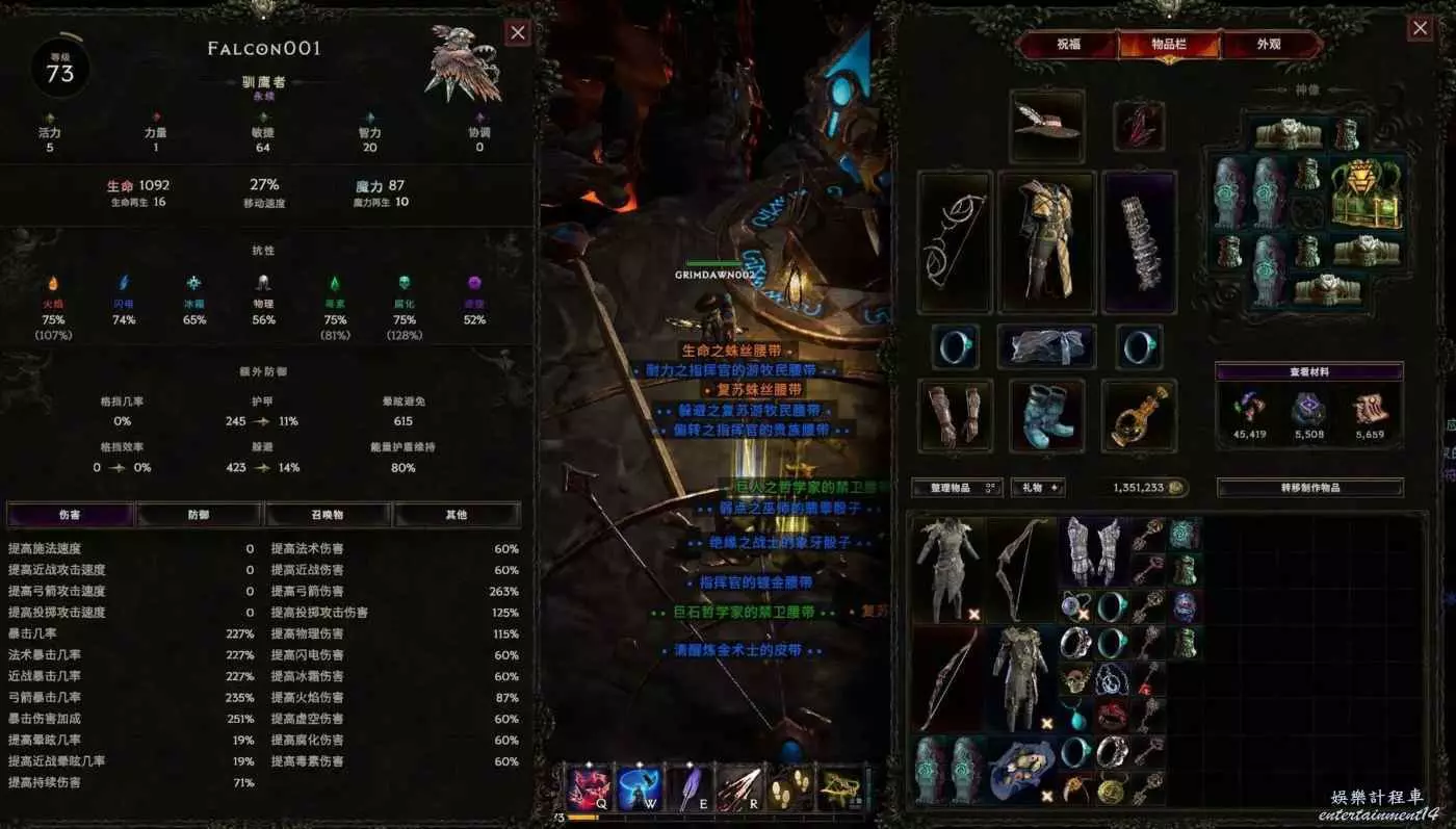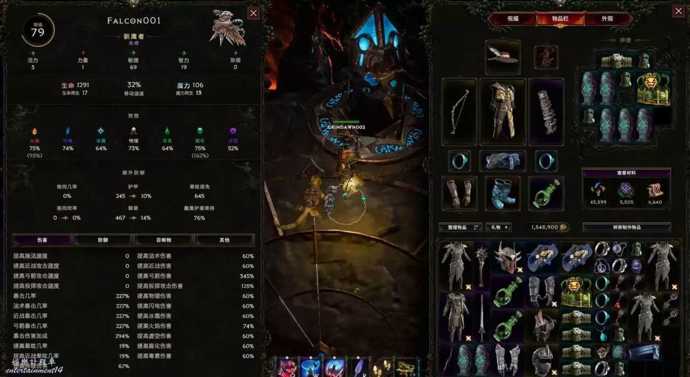 本bd圍繞召喚弩炮技能,堆積智力搭配空域襲擊獲取大量more傷輔助,堆積敏捷搭配暗金冰鞋得到大量寵物點傷加成,搭配賭徒項鍊達成輕而易舉的100%暴擊,最終構建出了超大範圍類似多重射擊的召喚弓流派,非常嗨~