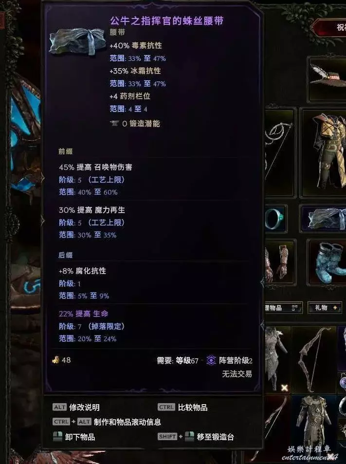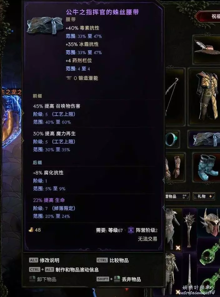 腰帶:蛛絲腰帶基底最好 大量毒抗和冰抗,首碼召喚物傷害 魔力再生 字尾 生命詞綴 抗性or冷卻速度