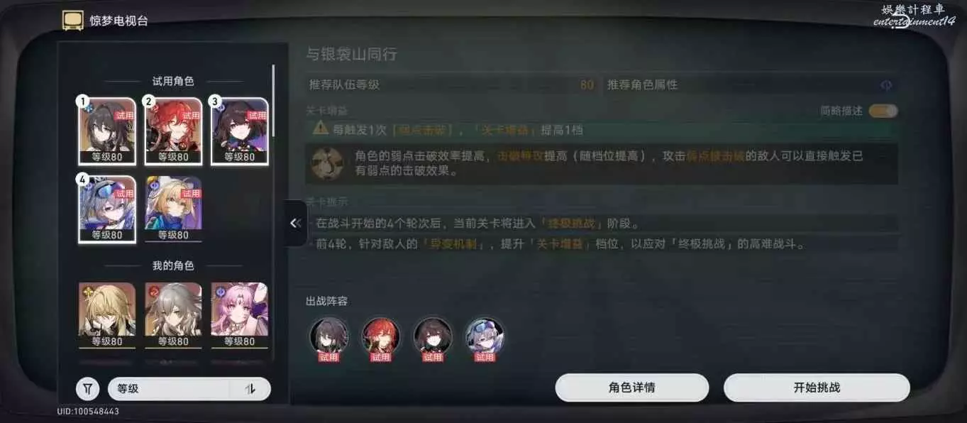 試用角色:卡芙卡、黑天鵝、桑博、盧卡、羅刹(必選,關卡傷害較高,生存壓力較大)