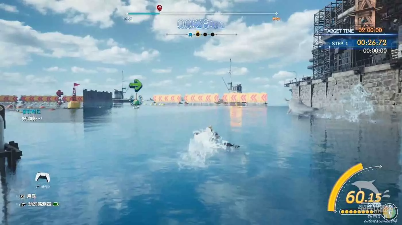 按下R2與左搖杆即可加速衝刺,你需要沿著賽道上航點進行衝刺,路上會遇到8個標記杆,你需要從標記杆旁邊跑過,注意:有時離的太遠系統不會啟動此標記杆。