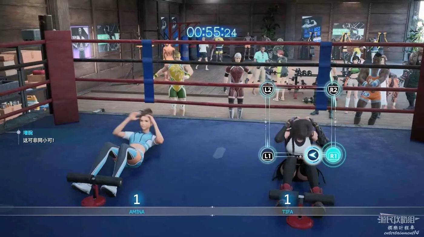 您必須在螢幕上顯示時按下R1/L1/L2/R2來完成仰臥起坐。按幾下肩部按鈕後,這些按鈕就會消失,您必須自己找到節奏。