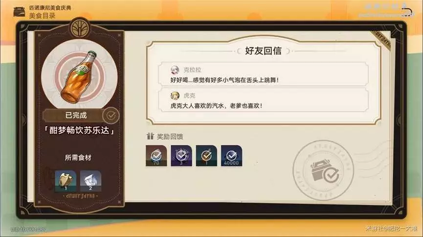 當開拓者提交「餐品食材」後,餐廳會寄出對應的「夢境美食」,屆時開拓者會收到相應好友的回信。