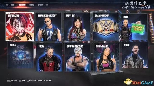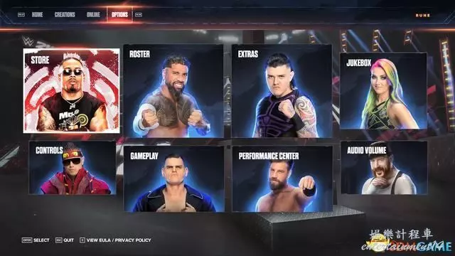 此功能表裡的選項用於自訂遊戲的各項內容,比較有趣的是自訂明星們的屬性(superstar)和招式調整(move-set)。