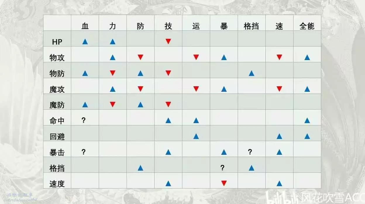 以下圖片內我只能保證每個單獨的成長類型對能力的影響,只能以↑和↓的方式表現,不能保證具體數值,至於雙同類型成長還有特殊影響(雙血、雙力等)。?代表有影響但需要特定組合時才能知道,都是減項。