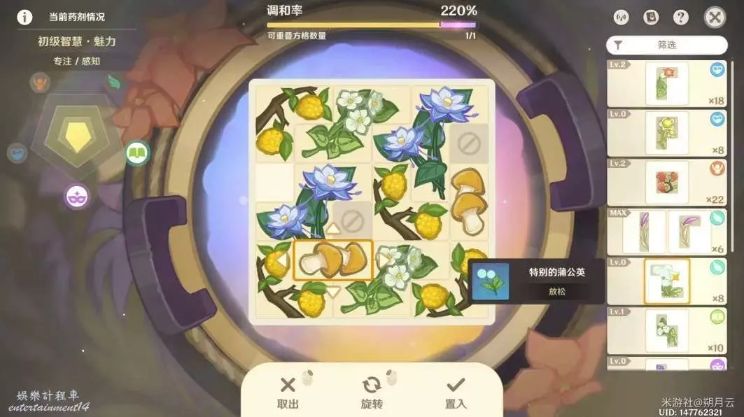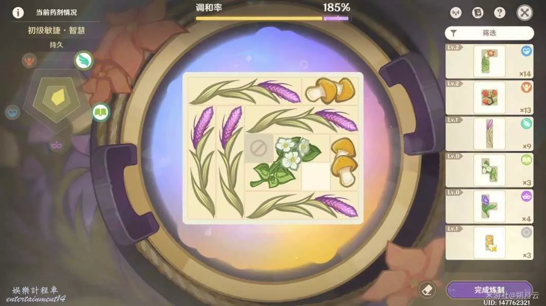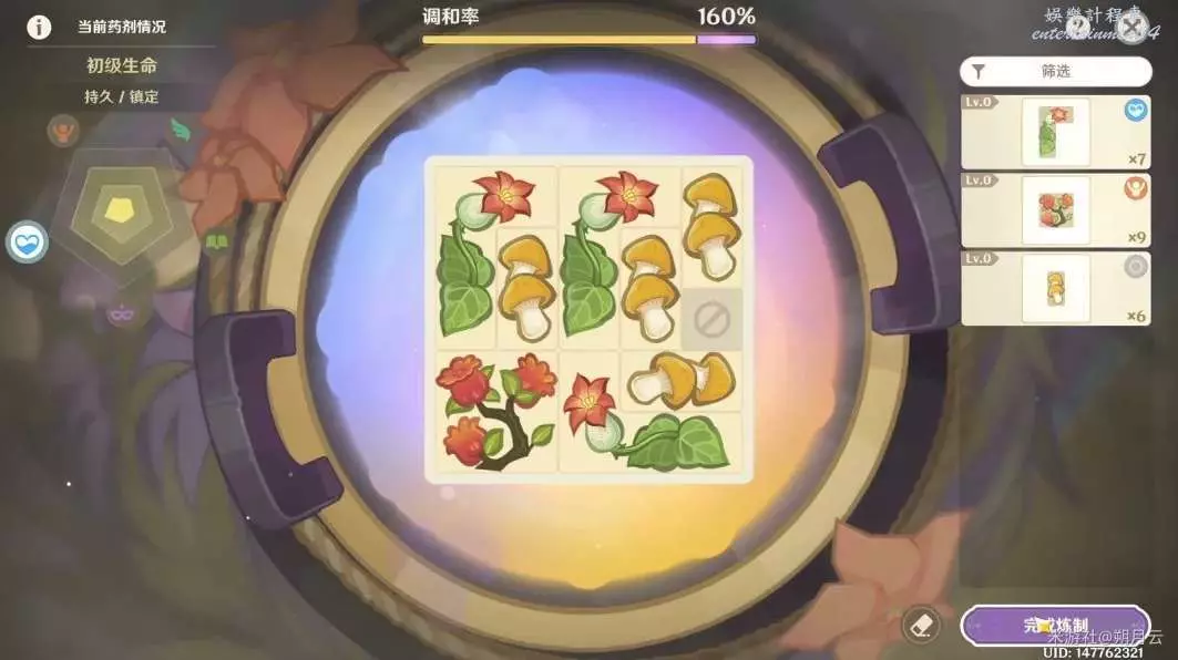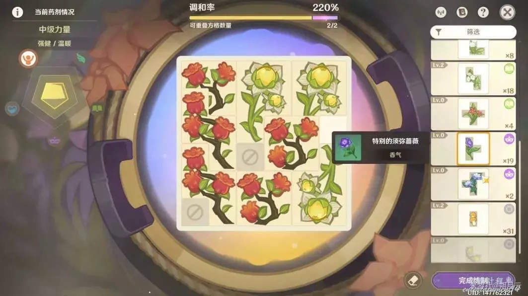 推薦儘量將格子排滿,如下圖所示;藥劑的調和率越高,成品的等級也就越高,上架售賣的價格自然越高。