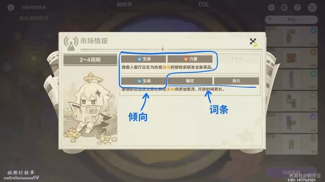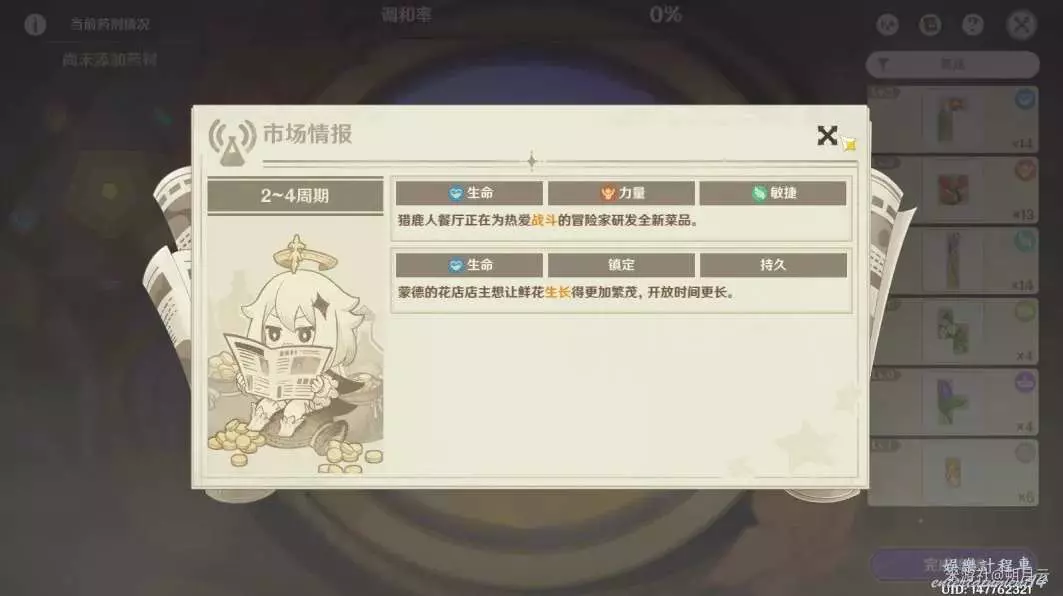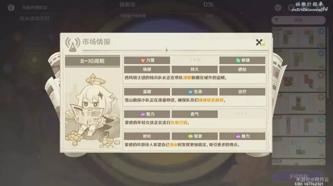 本階段的市場情報所需藥劑的傾向與詞條如圖所示。這一階段中,存在四個市場情報,隨機生效其中兩個。