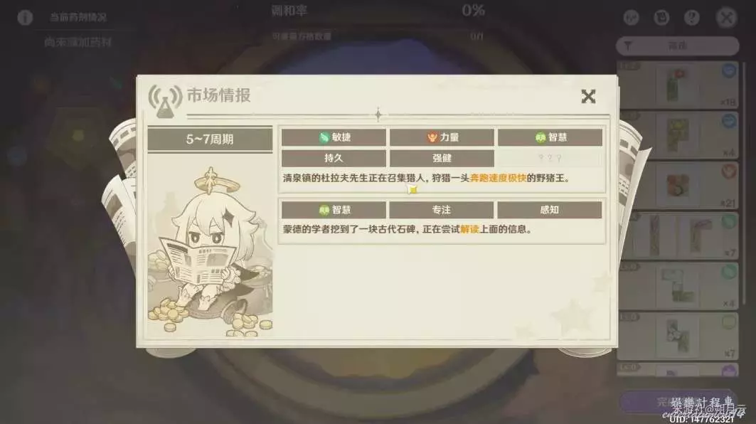本階段的市場情報所需藥劑的傾向與詞條如圖所示,所需傾向為智慧、力量、敏捷,所需詞條為持久、強健、專注、感知。