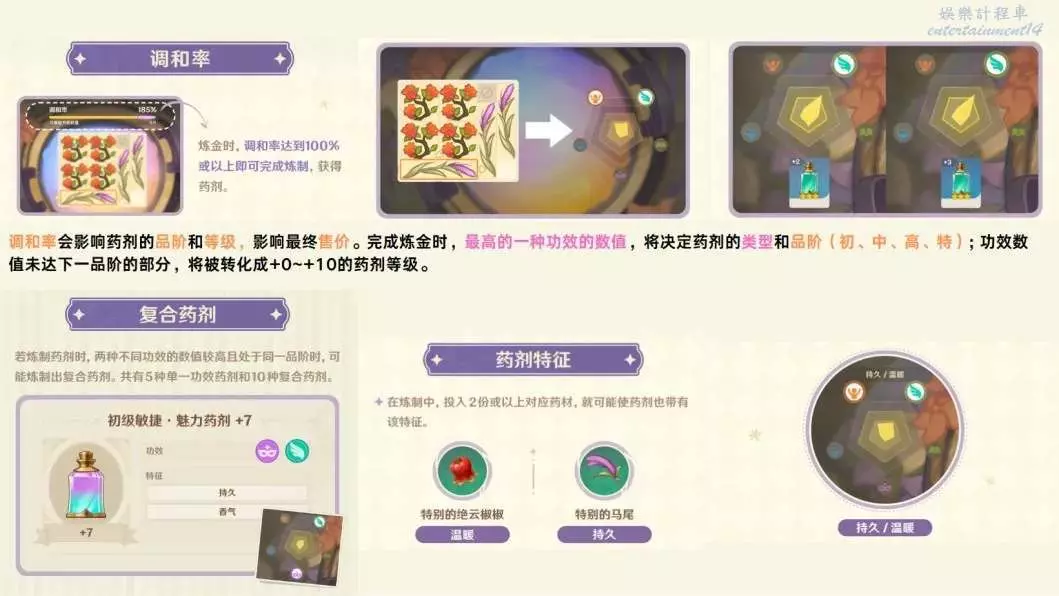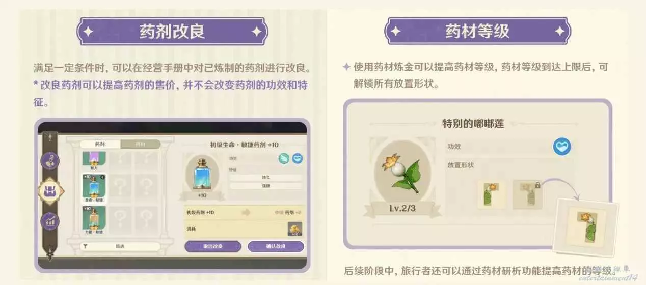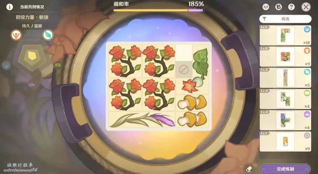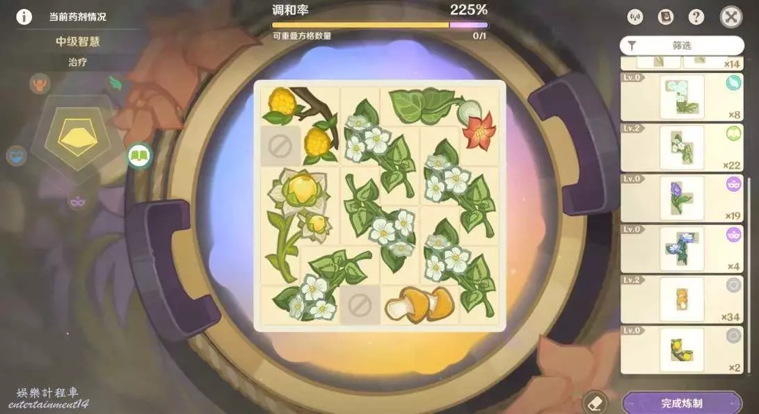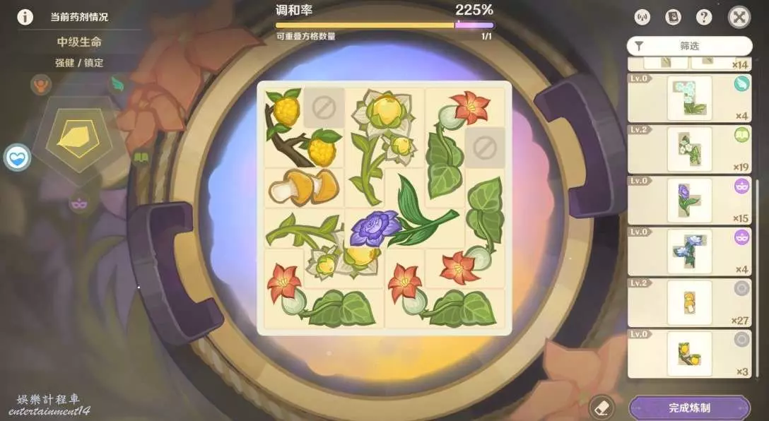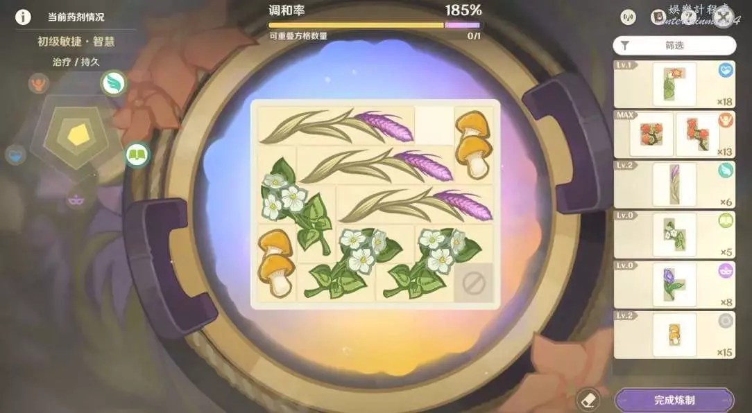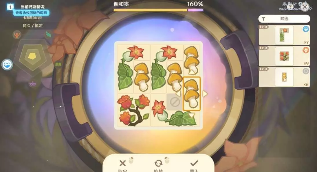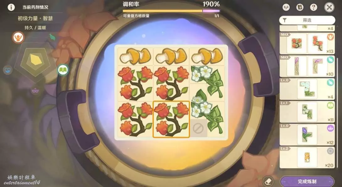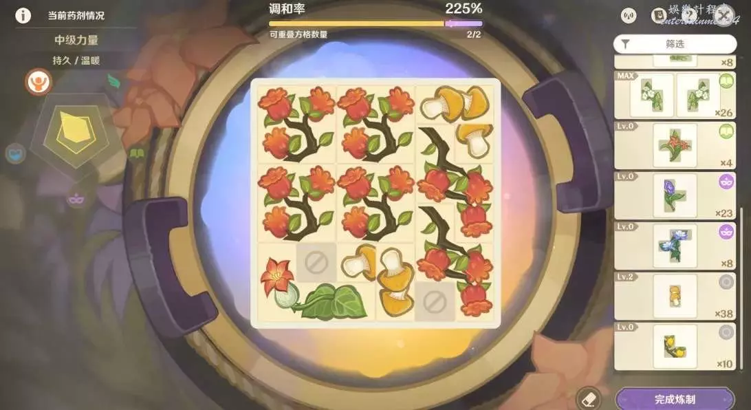 1.格子擺的越滿,藥劑等級和品級大幾率就越高!同一種藥材數量越多,品級越高!
