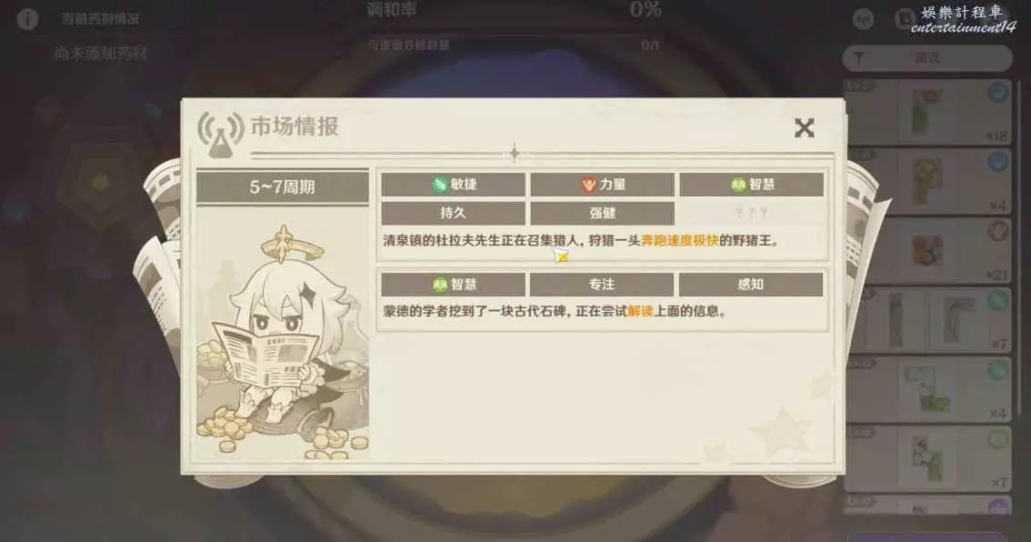 本階段的市場情報所需藥劑的傾向與詞條如圖所示,所需傾向為智慧、力量、敏捷(包含任意兩個傾向即可),所需詞條為持久、強健、專注、感知。