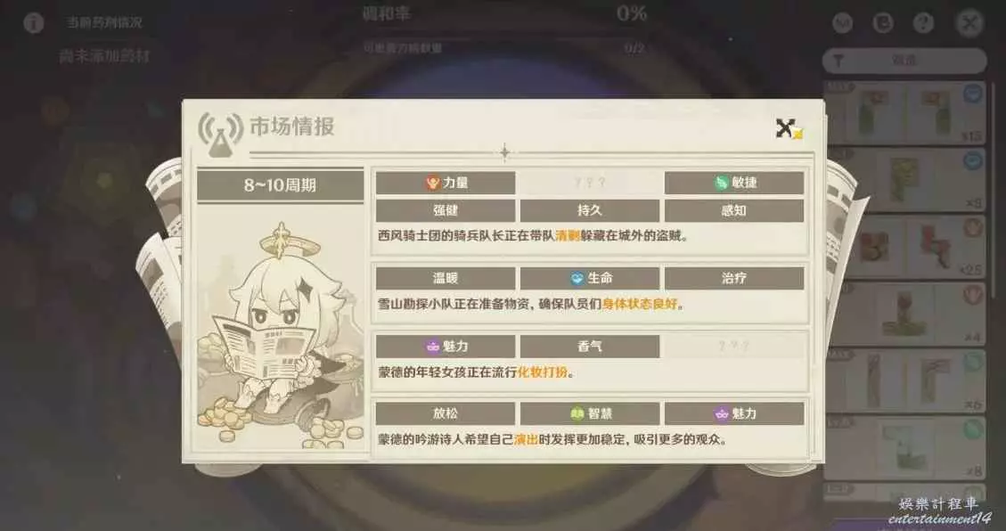 本階段的市場情報所需藥劑的傾向與詞條如圖所示。這一階段中,存在四個市場情報(如圖所示),隨機生效其中兩個!看自己是哪兩個情報!