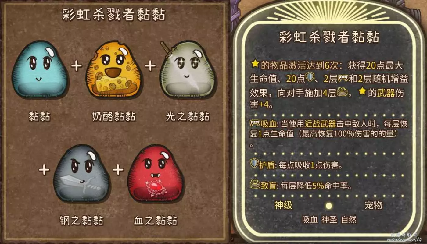 2.彩虹殺戮者黏黏(神級,吸血,神聖,自然,寵物):黏黏+乳酪黏黏+鋼之黏黏+光之黏黏+血之黏黏