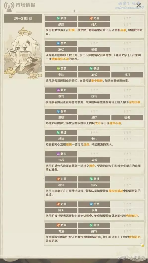 市場情報每一階段會在其中隨機2個(解鎖一個特定的經營助益後會變為3個)出現;如果存在更優的選擇,“傾向”會代替“詞條”在市場情報中展示。此部分可能出現的所有情報如下圖所示。