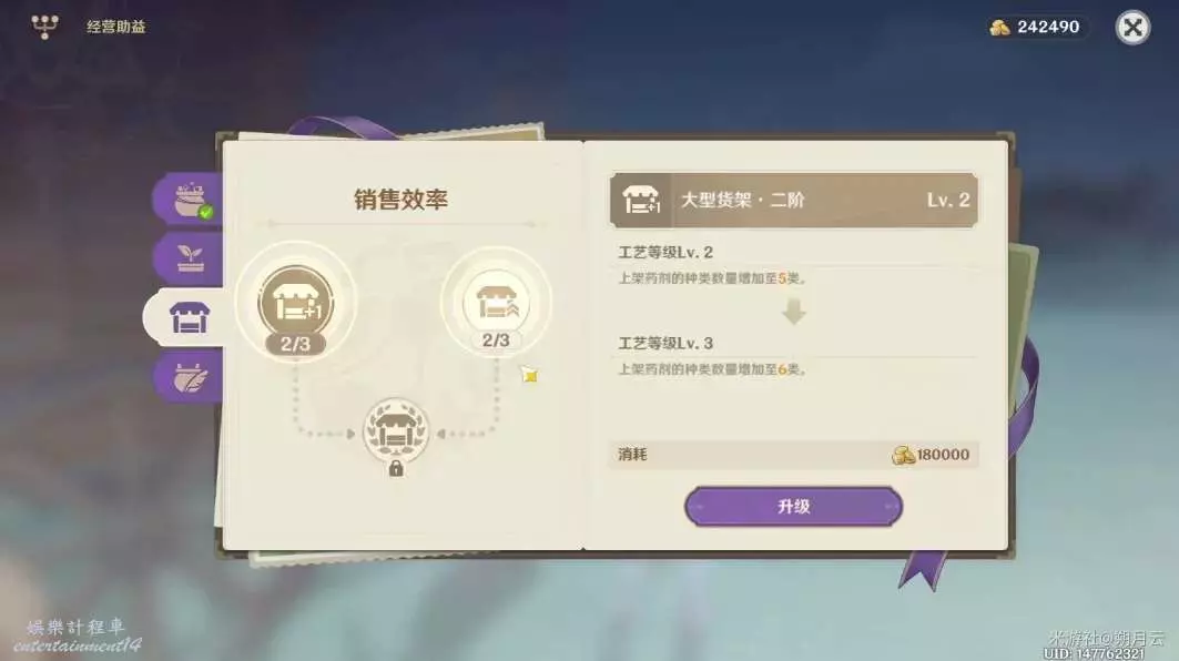 在活動的上一部分中,由於資金問題未升滿“經營助益”的,推薦在此部分活動開始以後,優先升級“銷售效率”中的“大型貨架”,再升級“煉製效率”中的內容,直到將“銷售效率”與“煉製效率”均升級至最高等級並解鎖兩個面板中的最終增益(擴充經銷商的事項可待資金充足後進行,整個過程大約需要2~4週期)。