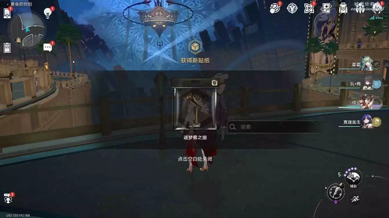 “逐夢客之眼”貼紙位置在地圖【黃金的時刻】2層天橋上,可以從1層的鐘錶小子廣場傳送點往上走到達。