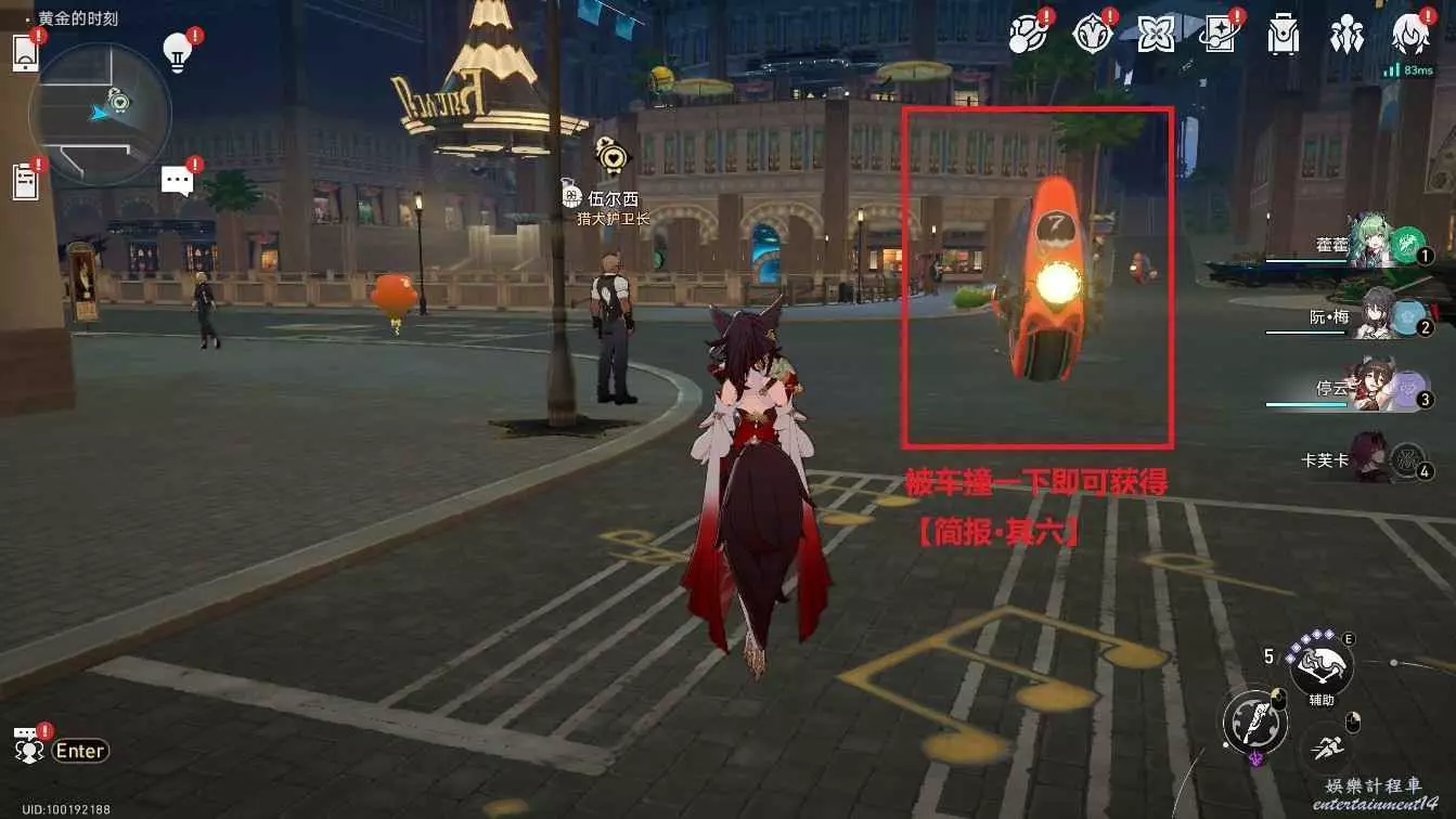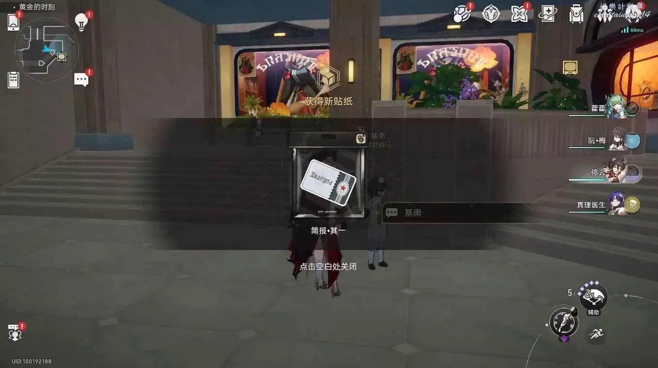 在地圖【黃金的時刻】1層沉夢商街下方區域與npc基南對話,完成對話後即可獲得貼紙“簡報·其一”。