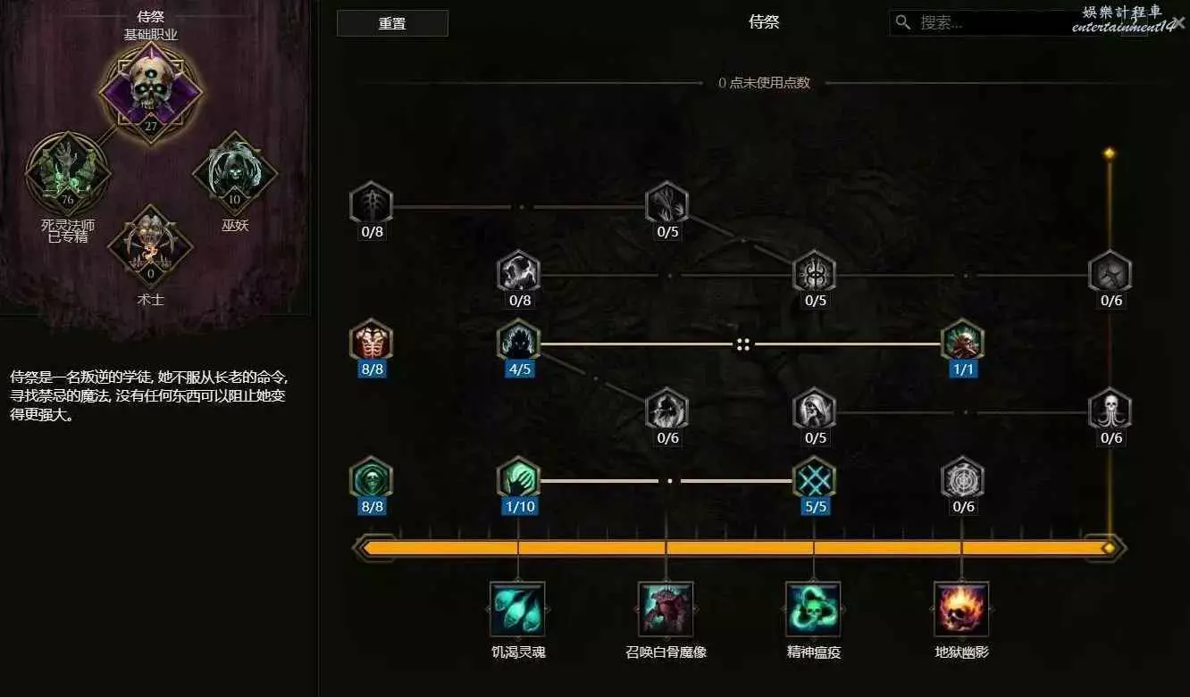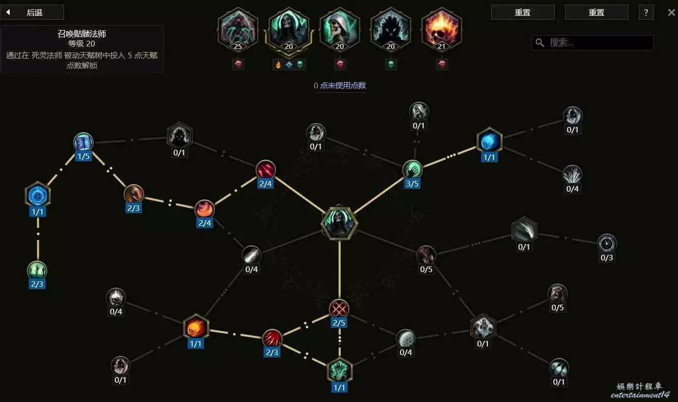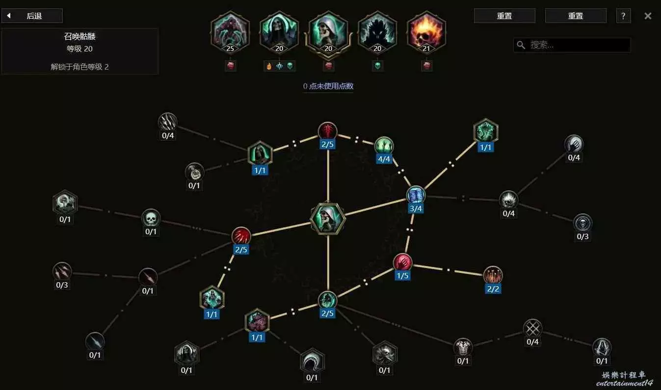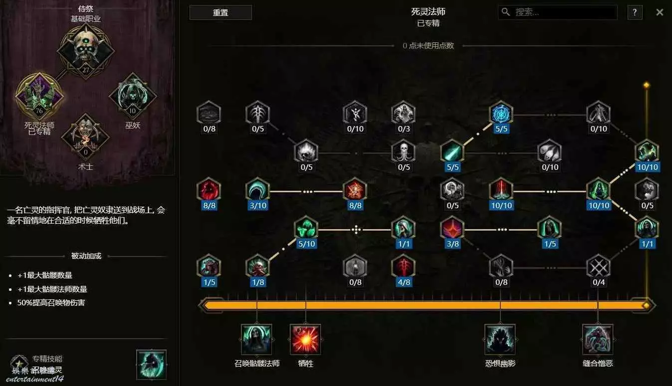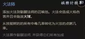 同上方的召喚骷髏法師一樣的思路,我們儘量提高召喚物的數量,將整個天賦中3個增加骷髏數量的天賦點全部點出,點出額外一個種類的骷髏遊蕩者,並且點滿