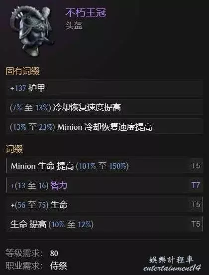 基底選擇不朽王冠提高召喚物冷卻和我們自己的冷卻,一定要記住一個點,要用智力替換掉任何召喚物傷害詞綴,因為智力一點是提升4%召喚物,並且還能提高4%的能量維持,儘量摸T7智力