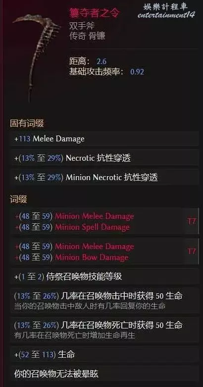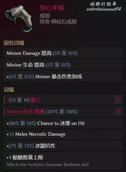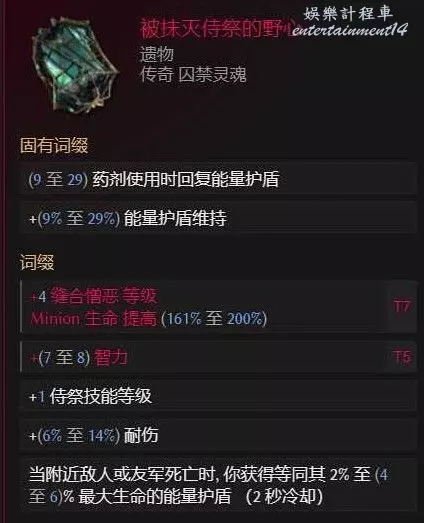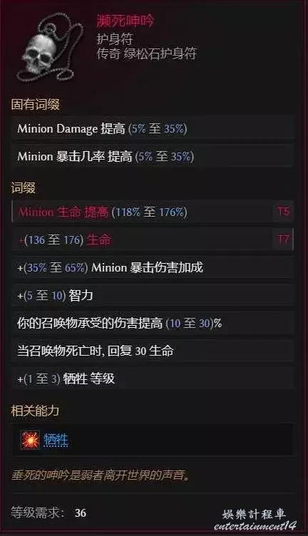 瀕死呻吟一個,因為我們的召喚物為滿爆,所以爆傷提升非常巨大,爆傷和智力這兩個詞條越高越好,詞條的話搞個T7生命合上去即可