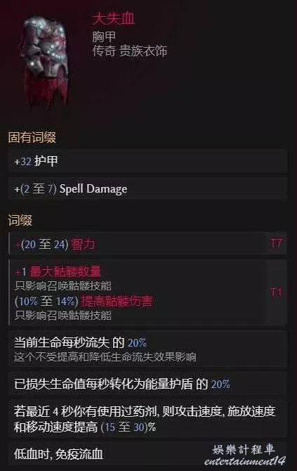 大失血一枚,低血流派必備胸甲,血量越高,護盾越高,最好是兩孔的,一個T7智力加一個加1最大骷髏數量即可,一個骷髏我們的憎惡就是提高15%傷害。