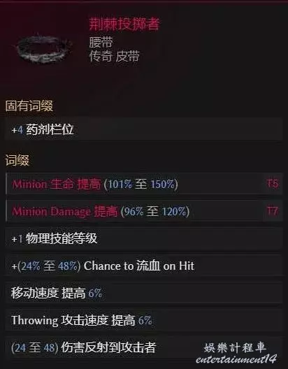 荊棘投擲者,主要是為了他的加1物理技能等級,憎惡非常吃技能等級,越高越好,詞條的話搞召喚物傷害和生命即可。或者你自己搞抗性,生命,暴擊避免等生存類詞條也可以,靈活調整。