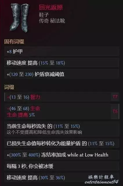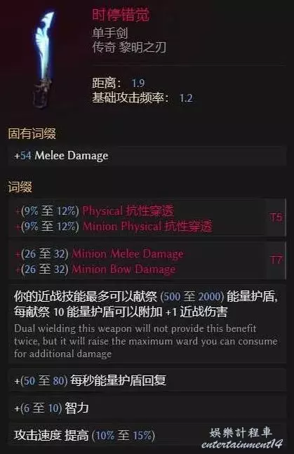 時停錯覺,一個T7的召喚物近戰點傷加一個物理穿透即可,每秒能量護盾和智力越高越好,完美的低血武器。