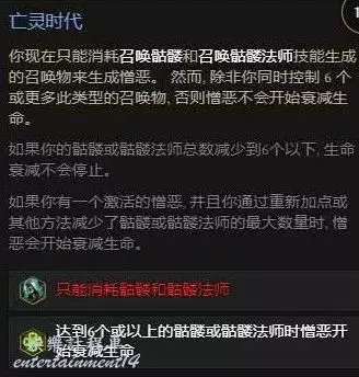 亡靈時代,雖然讓我們的憎惡沒辦法再吃更多其他技能的召喚物,但是卻可以永久存在,前提是,不能同時存在6個以上的來自召喚骷髏還有骷髏法師這兩個技能的召喚物,因為骷髏法師最多也就存在5個,所以後續通過不攜帶召喚骷髏這個技能來讓我們的憎惡保持永存。