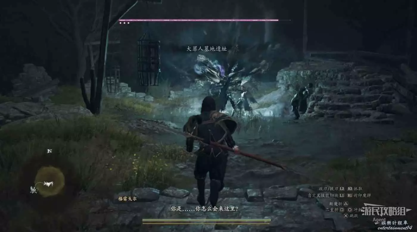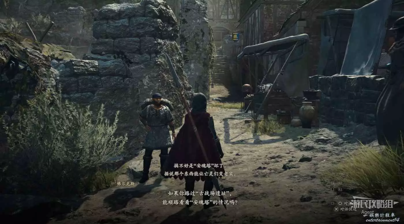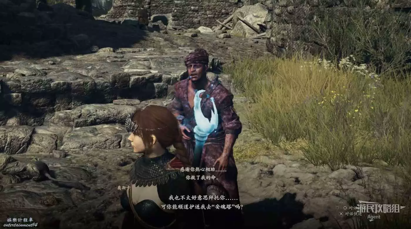 到下圖位置幫奧斯卡打怪,接到支線任務“鎮魂之鐘”,跟著他前往古戰場遺址調查安魂塔。