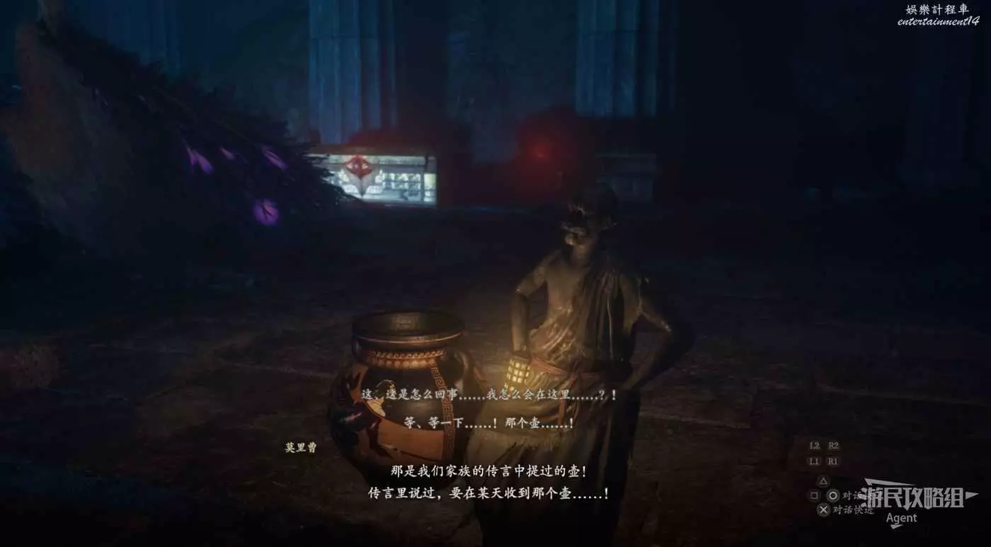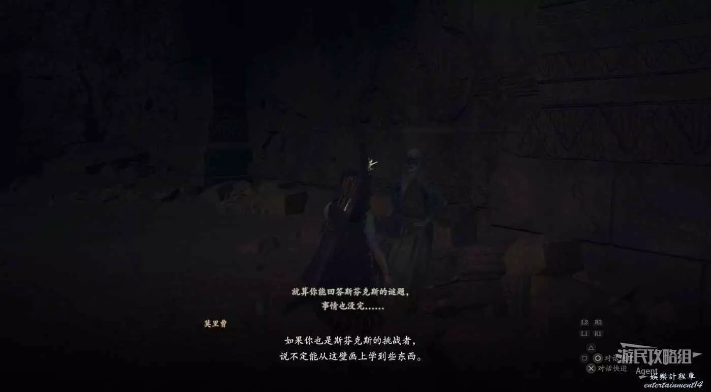 繼續往前走,穿過神殿回廊,來到山嶽神殿見到斯芬克斯,站在他面前的圓臺上與之對話。
