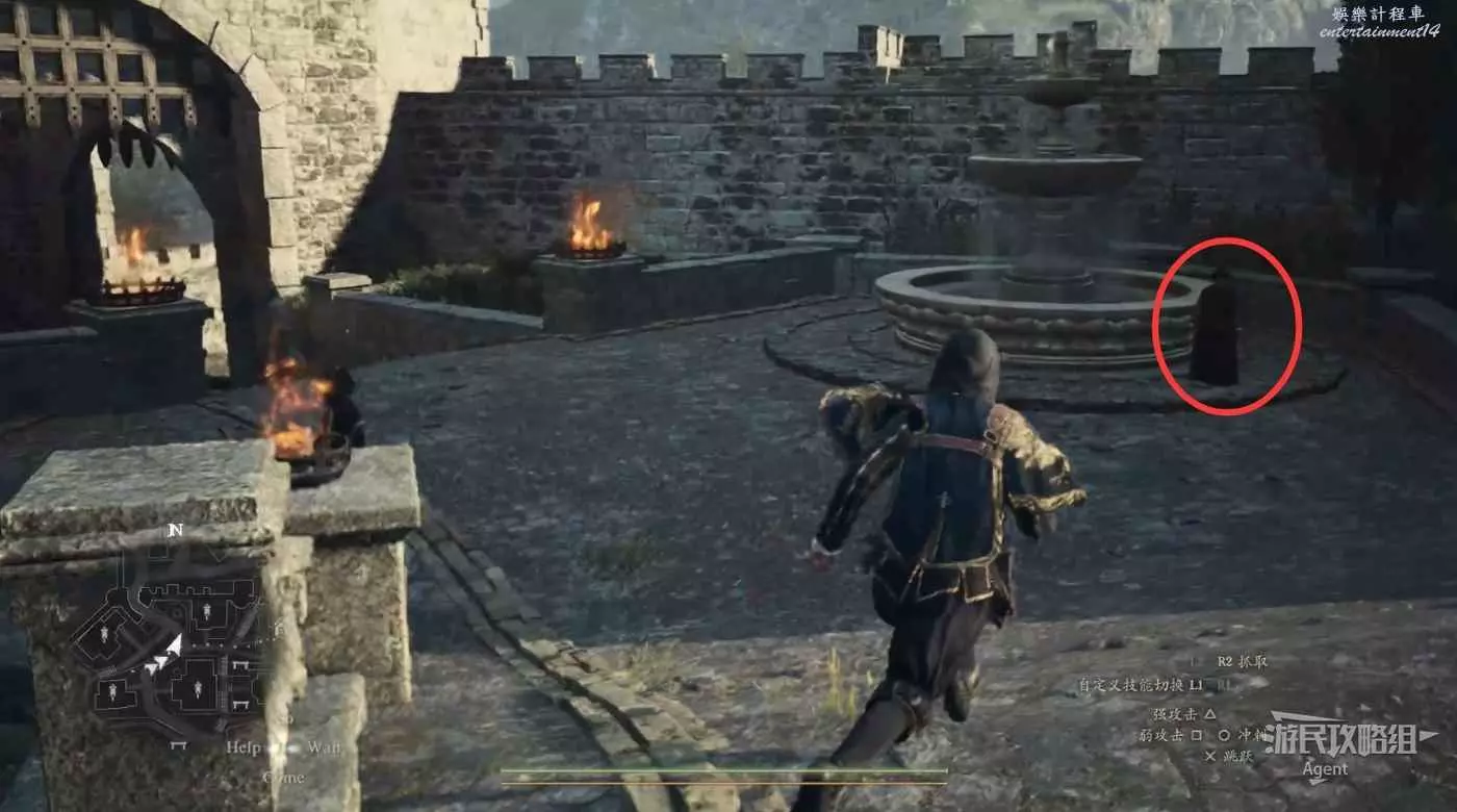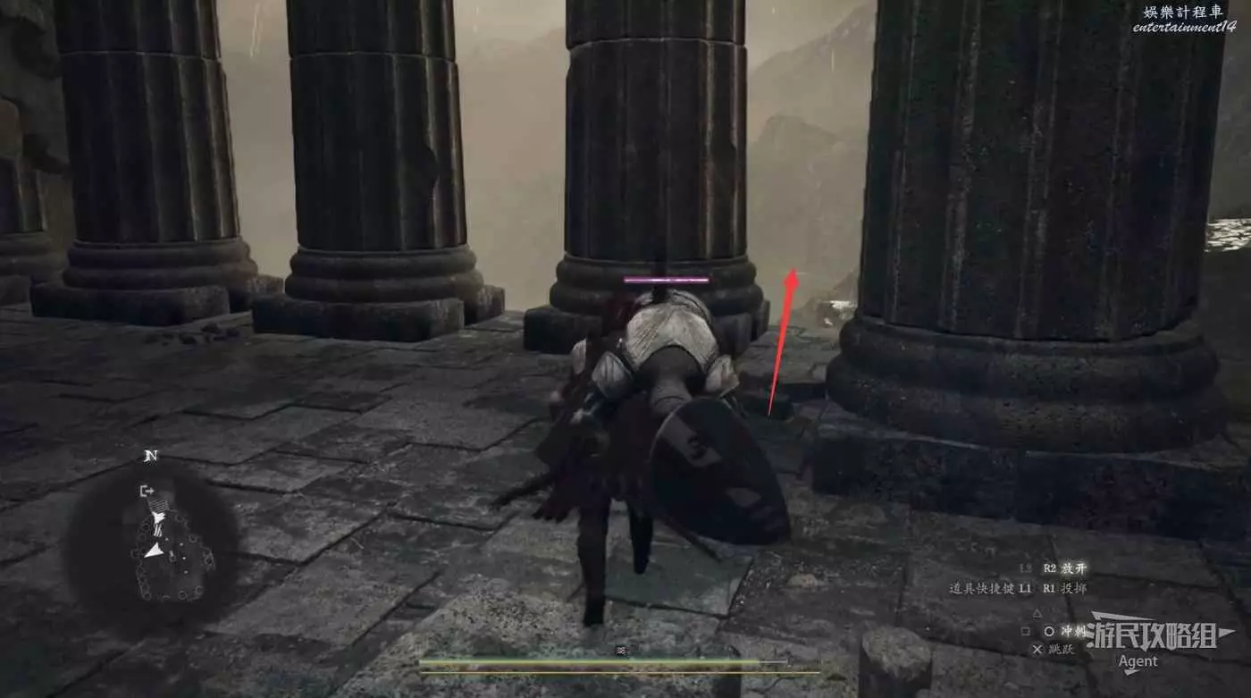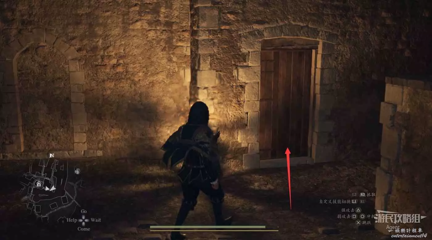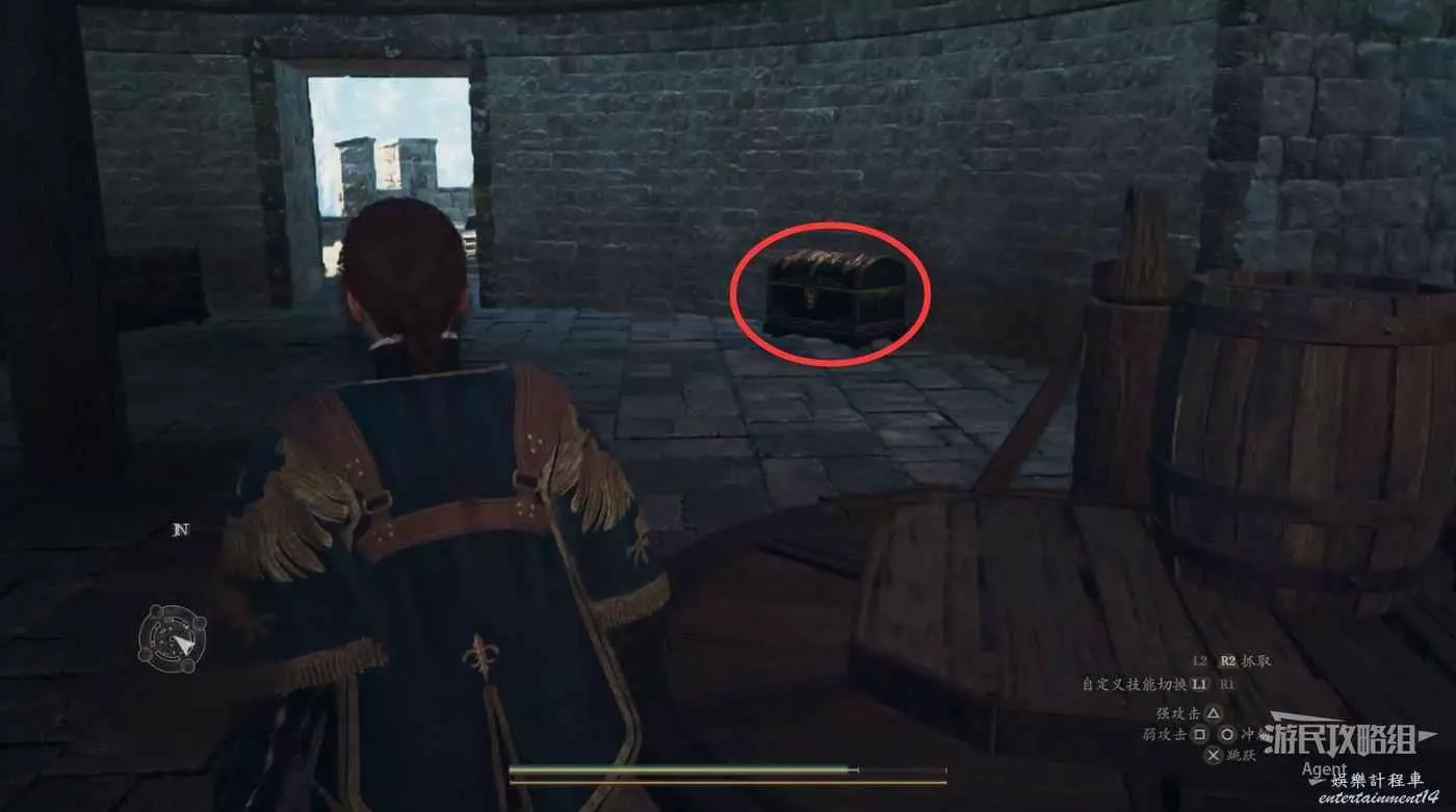 注意螢幕左下角的小地圖,顯示這裡有個寶箱。這個寶箱其實就在大門上方,從側面可以跳上去拿。