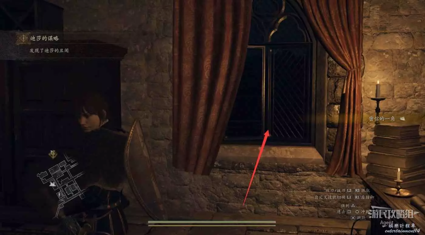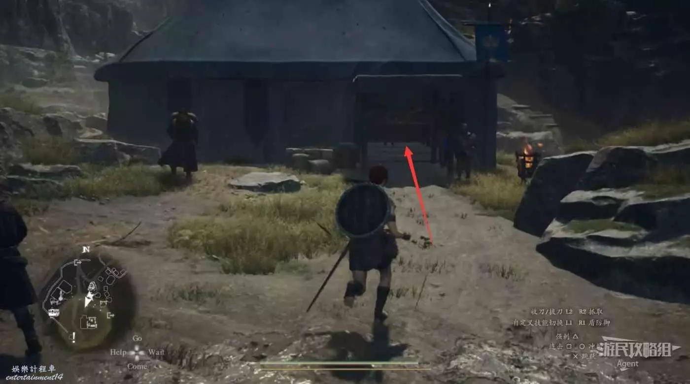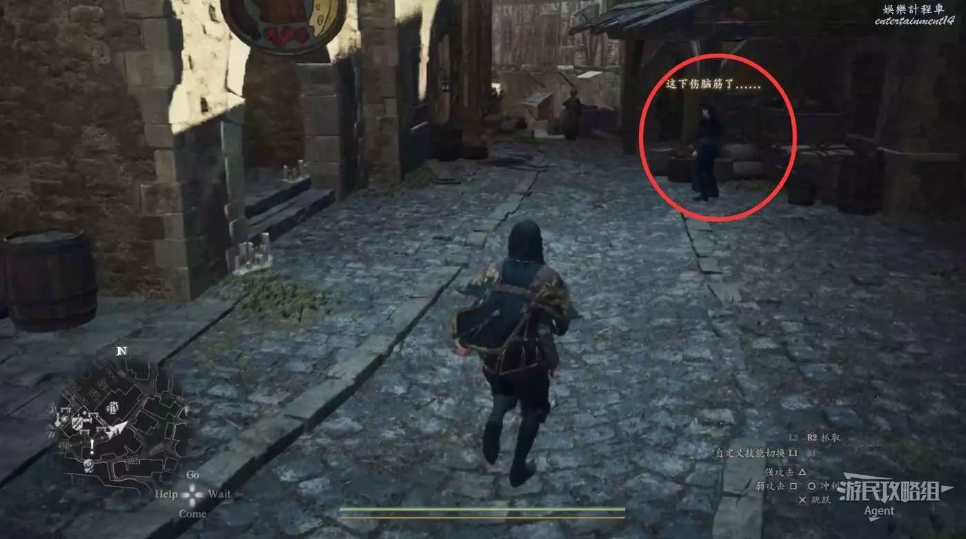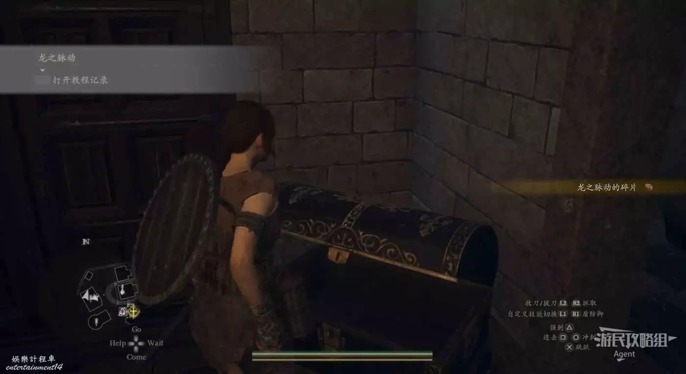 注意螢幕左下角的小地圖,顯示這裡有個寶箱。這個寶箱其實就在大門上方,從側面可以跳上去拿。