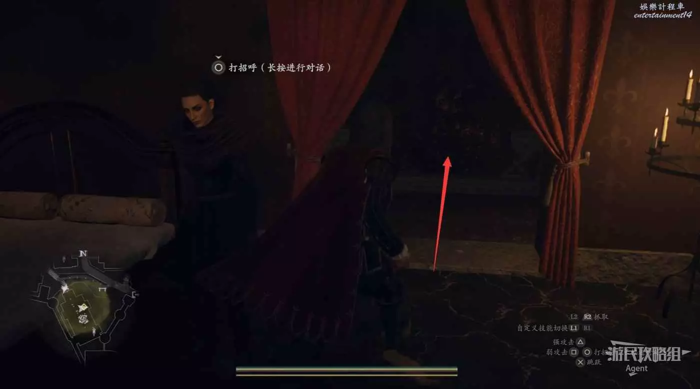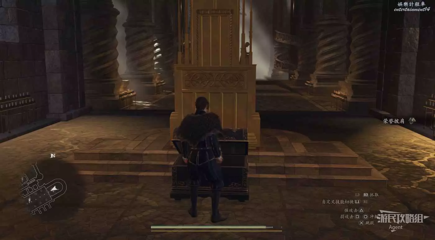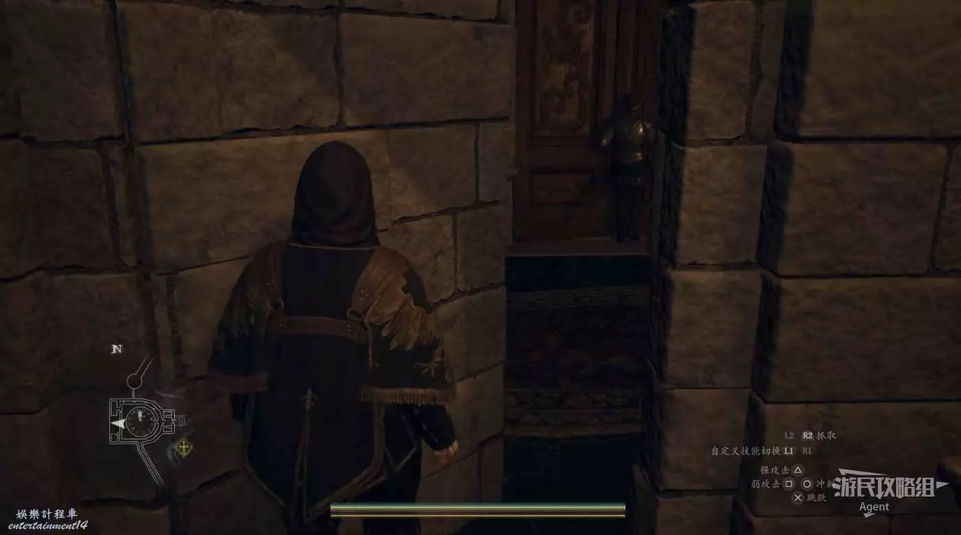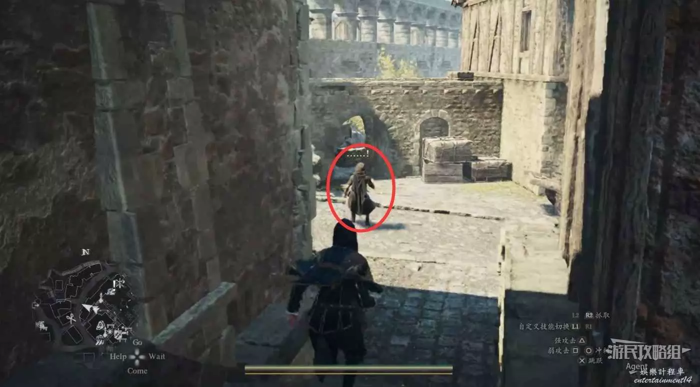 注意螢幕左下角的小地圖,顯示這裡有個寶箱。這個寶箱其實就在大門上方,從側面可以跳上去拿。