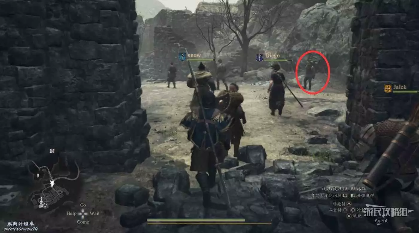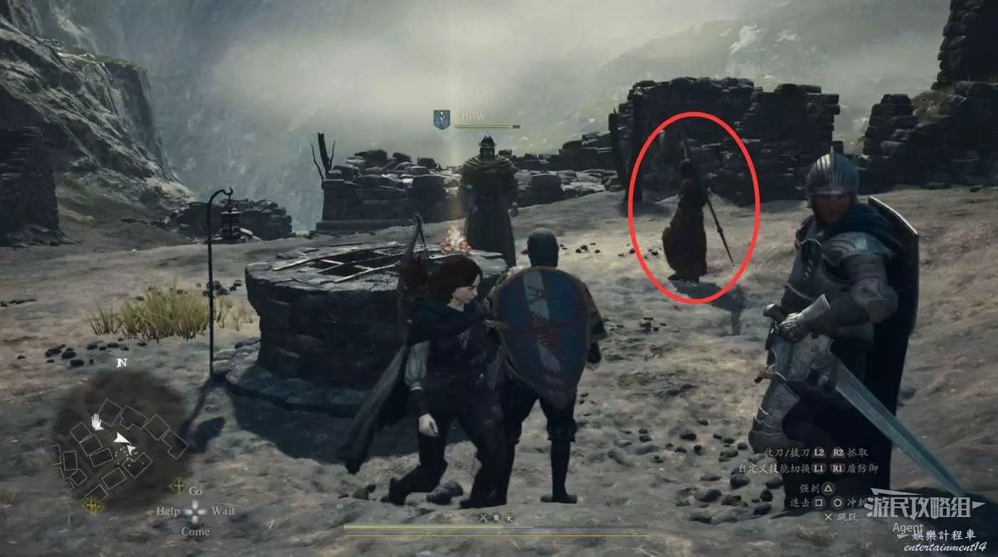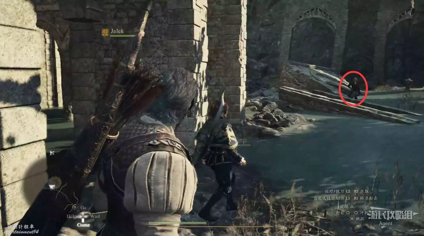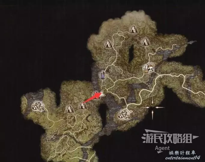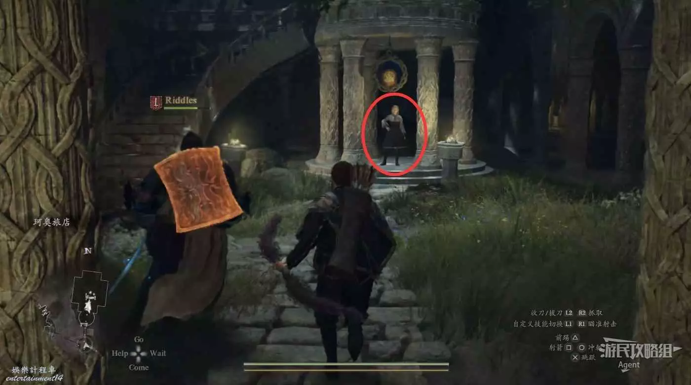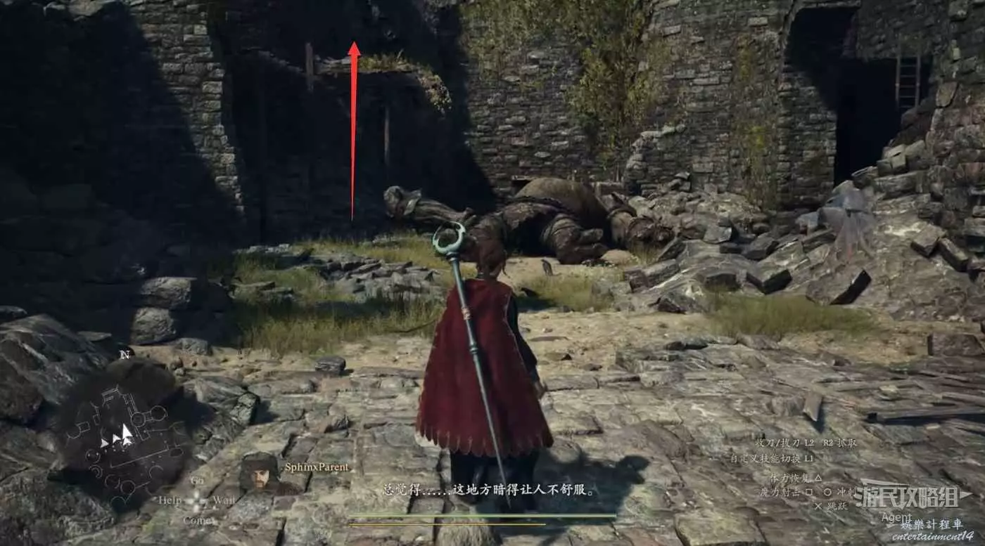 2、到關口旅店村東北方不遠處,在下圖位置的塔里的異界石,雇傭一個叫做SphinxParent(SphinxFather或SphinxMother也行)的追隨者,這是卡普空提供的官方追隨者,如果找不到就斷網,離線狀態下再看。