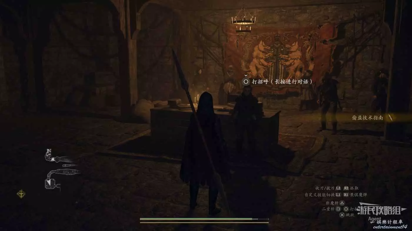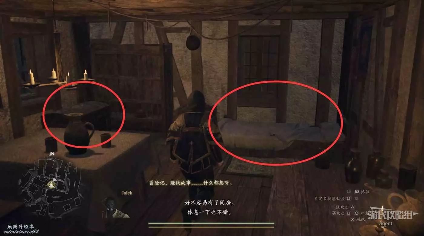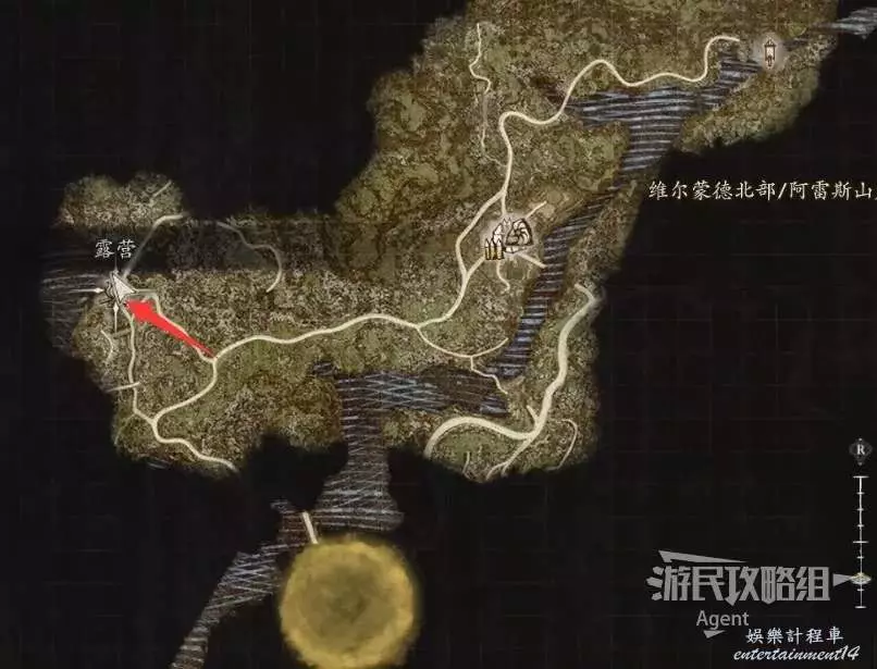 下圖位置有篝火和野營用具,可以露營。效果和旅店住宿一樣,回滿血。