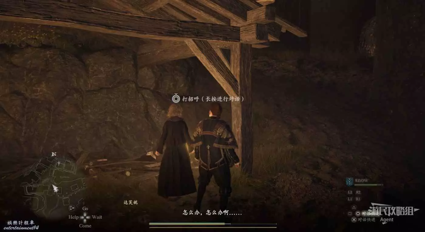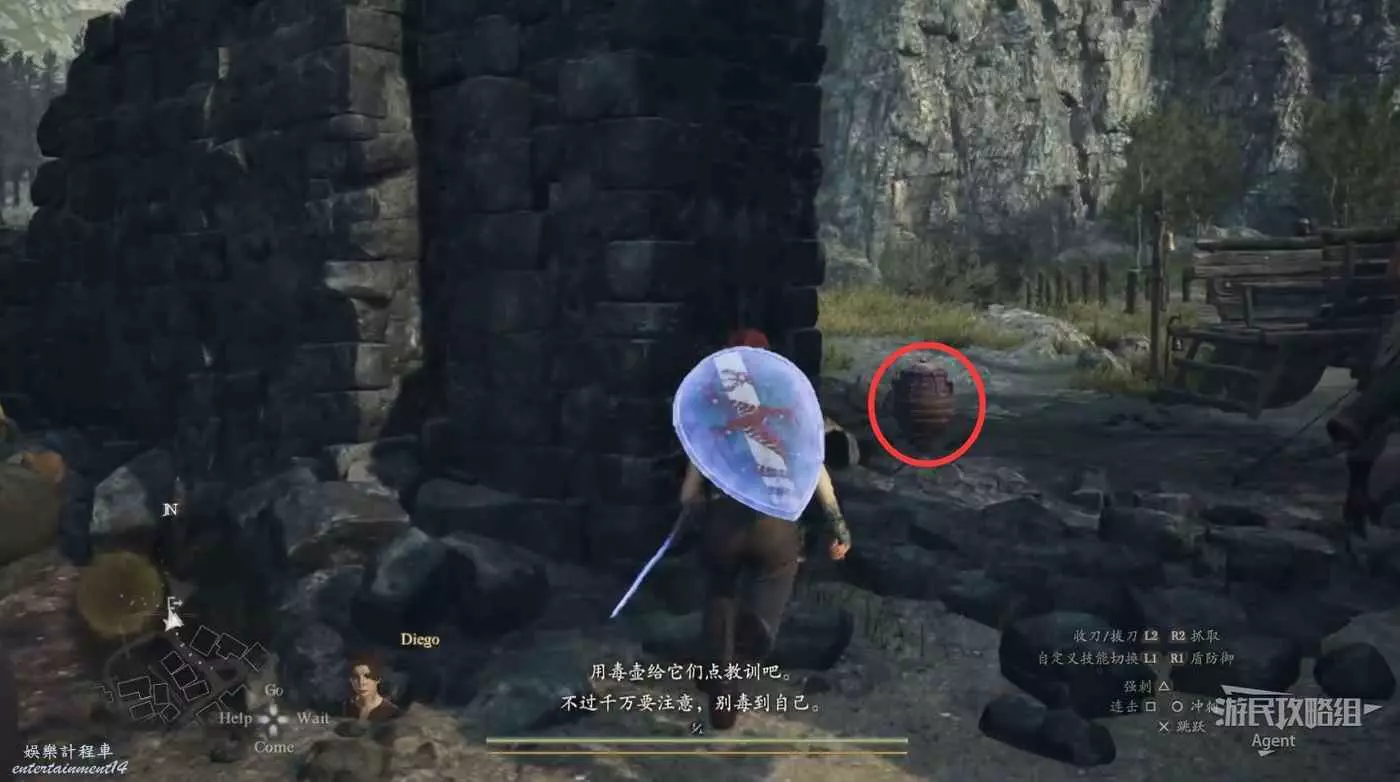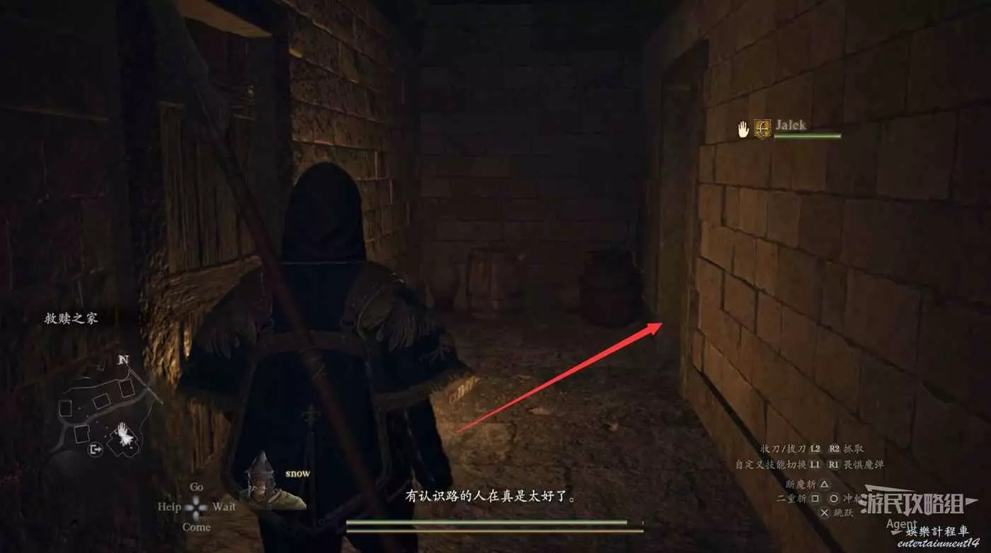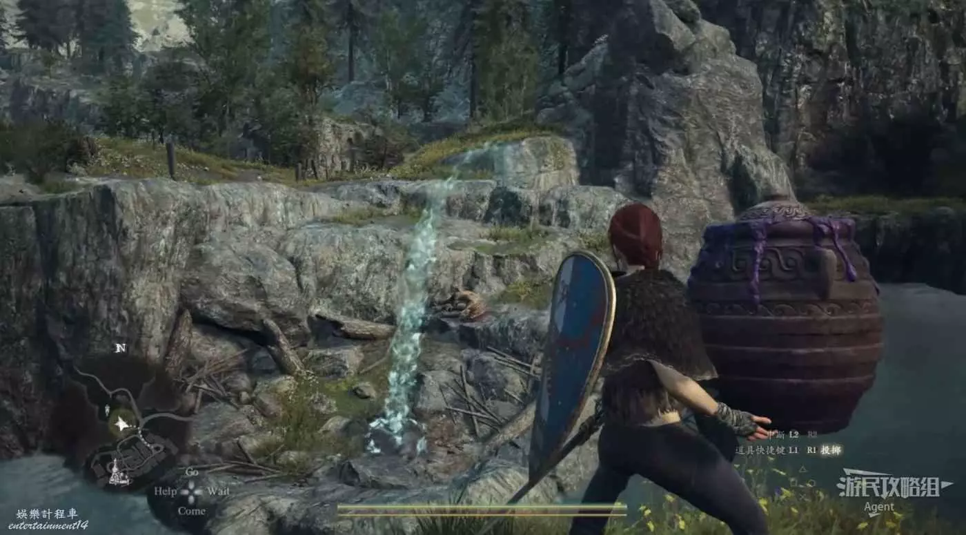 到洞裡抱塊石頭出來,放到盧克身旁。這是抓取能力的教學,小怪或物體可以用抓取能力抱起來扔出去,大怪可以用抓取能力爬到它身上去。